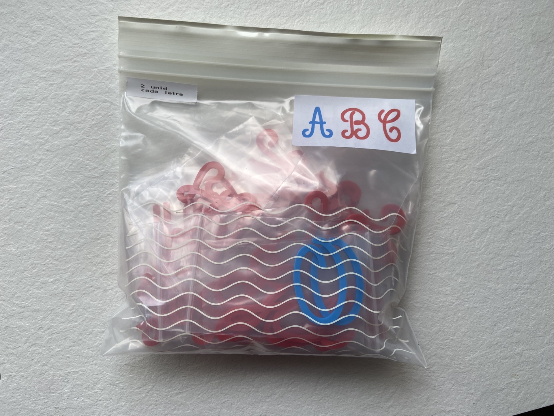 As letras estão organizadas em conjuntos de 2 letras iguais em sacos zip, enviadas num saco zip maior.