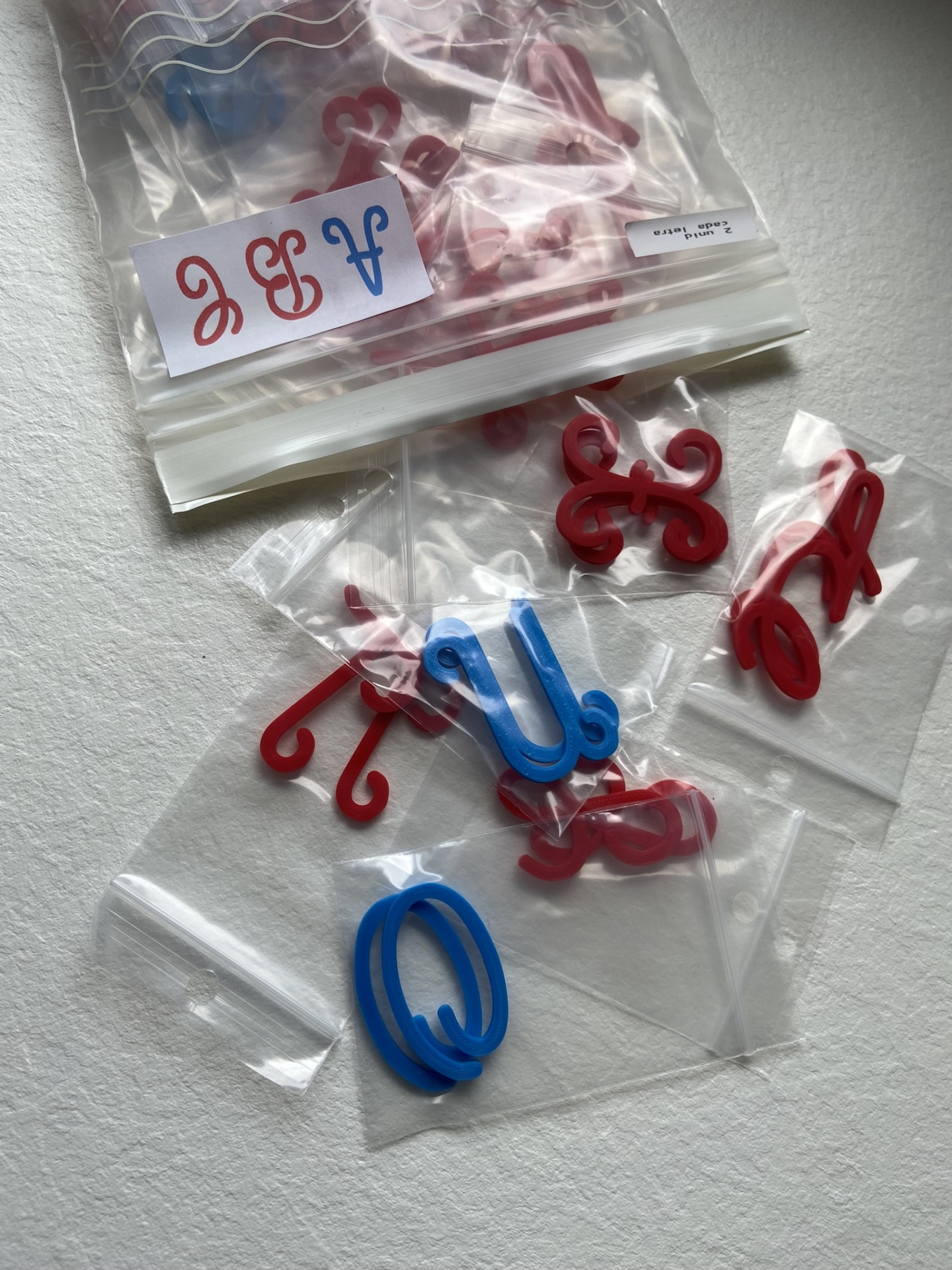 As letras estão organizadas em conjuntos de 2 letras iguais em sacos zip, enviadas num saco zip maior.