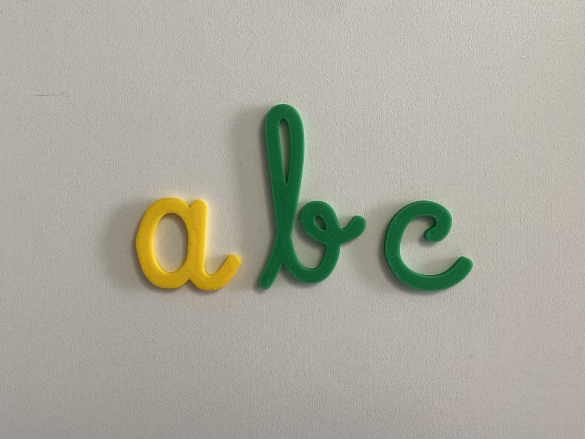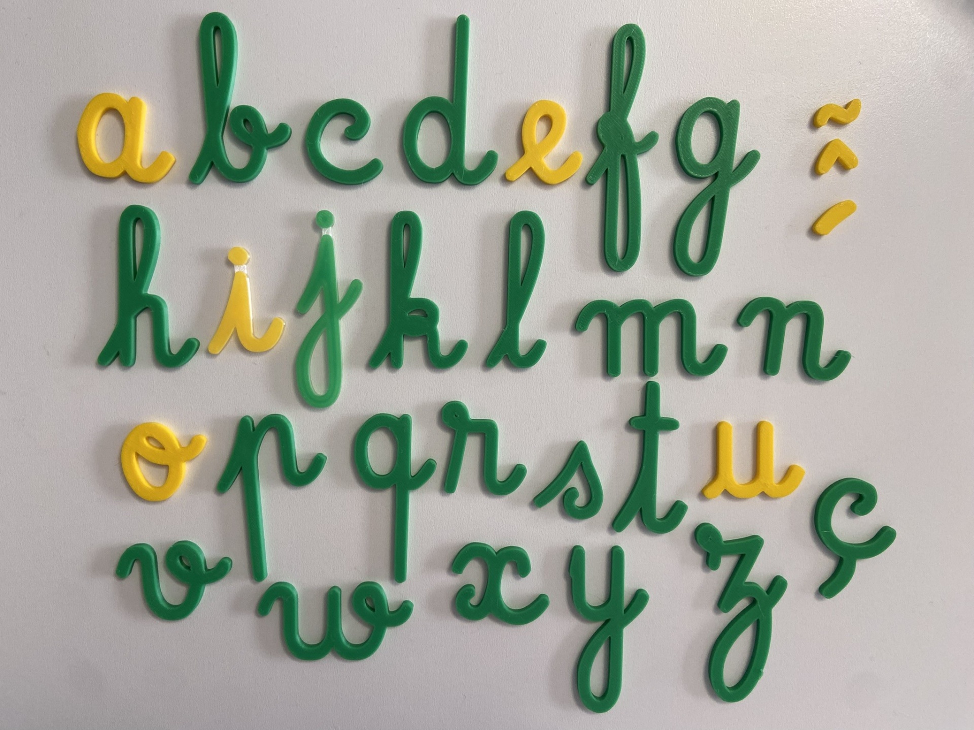 Alfabeto móvel # Letras cursivas # Minúsculas # 1 unidade de cada letra 5,00 € Desconto de %. Partilhar Comprar Contactar Alfabeto móvel # Letras cursivas minúsculas Com este alfabeto queremos proporcionar uma experiência de aprendizagem envolvente para os pequenos aprendizes. A fonte cursiva cuidadosamente escolhida e aliada à impressão 3D, criam uma experiência que estimula os sentidos e inspira a curiosidade e autonomia. Este alfabeto contém 1 unidades de cada letra 1 unidades de cedilha / acentos Cor das vogais: amarelo Cor das consoantes: verde Dimensões: A letra "a" tem 2,5 cm de altura. As letras são enviadas num saco zip. Material: PLA O PLA (ácido polilático) é um material biodegradável e sustentável, derivado de fontes renováveis - como o amido de milho. Idade recomendada: +3 anos Contém peças pequenas que podem ser ingeridas. Utilizar com supervisão de um adulto. # ref. 380 # Marca misa3D
