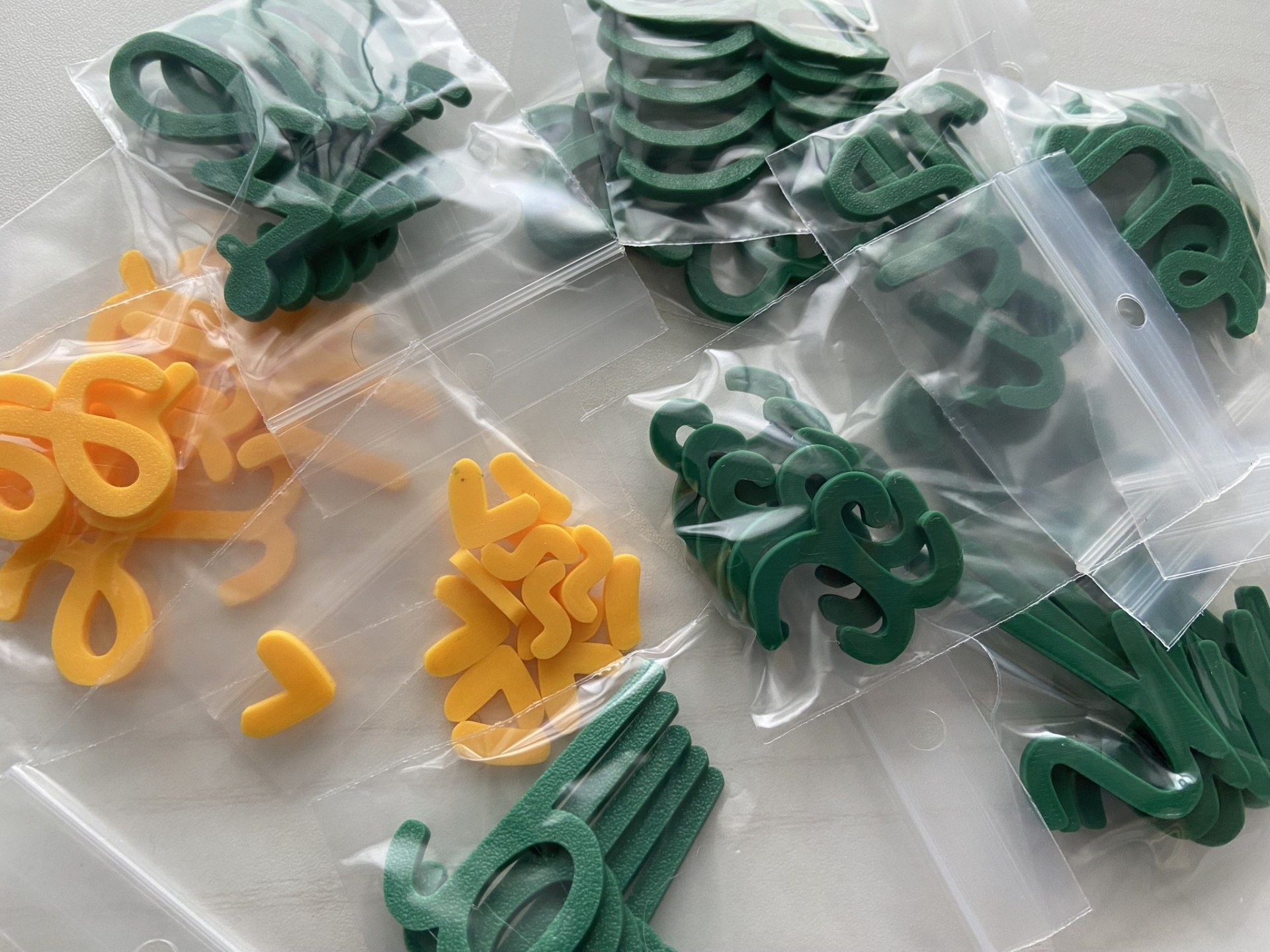 As letras estão organizadas em conjuntos de letras iguais em sacos zip, enviadas num saco zip maior.
