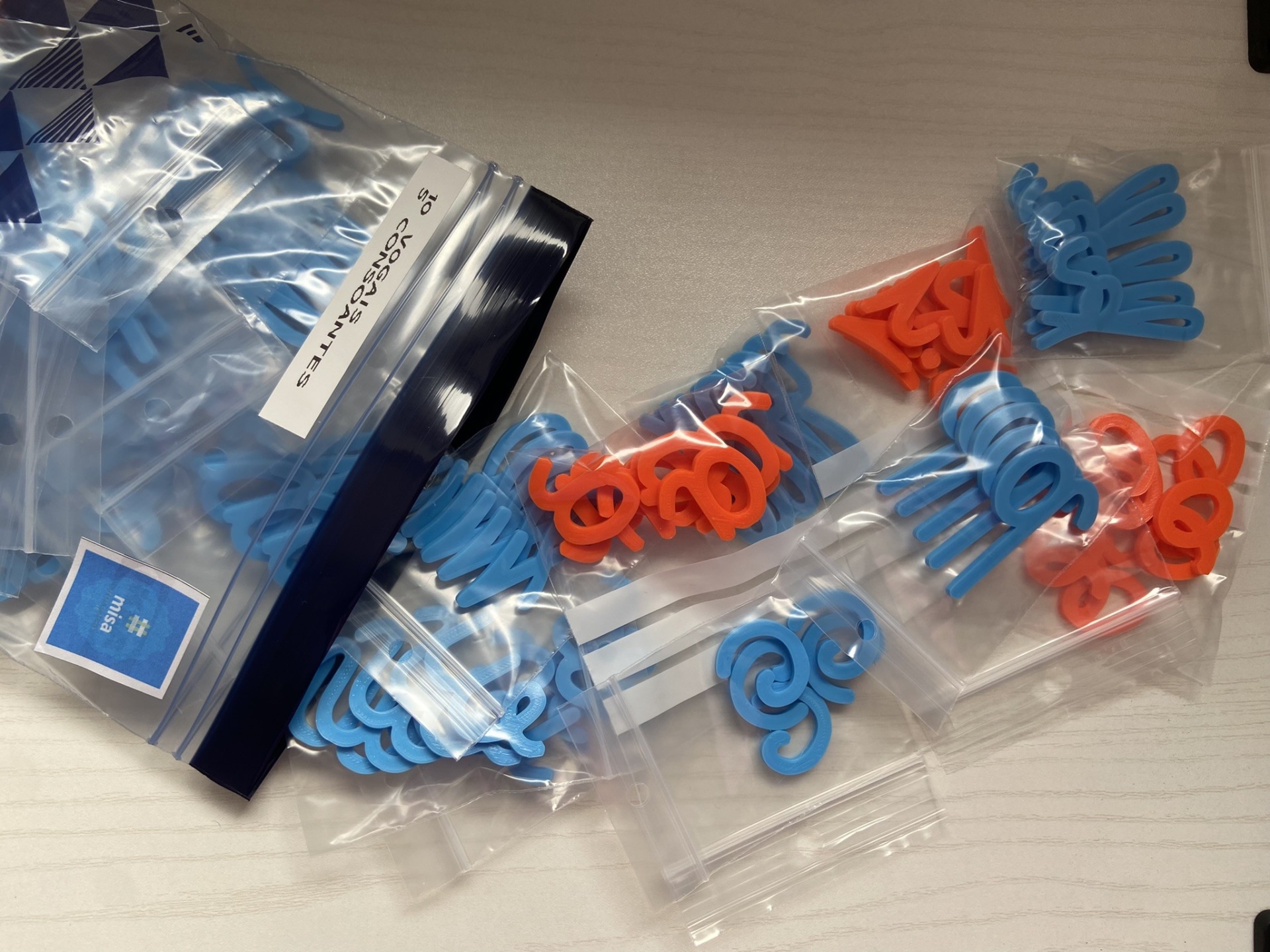 As letras estão organizadas em conjuntos de letras iguais em sacos zip, enviadas num saco zip maior.