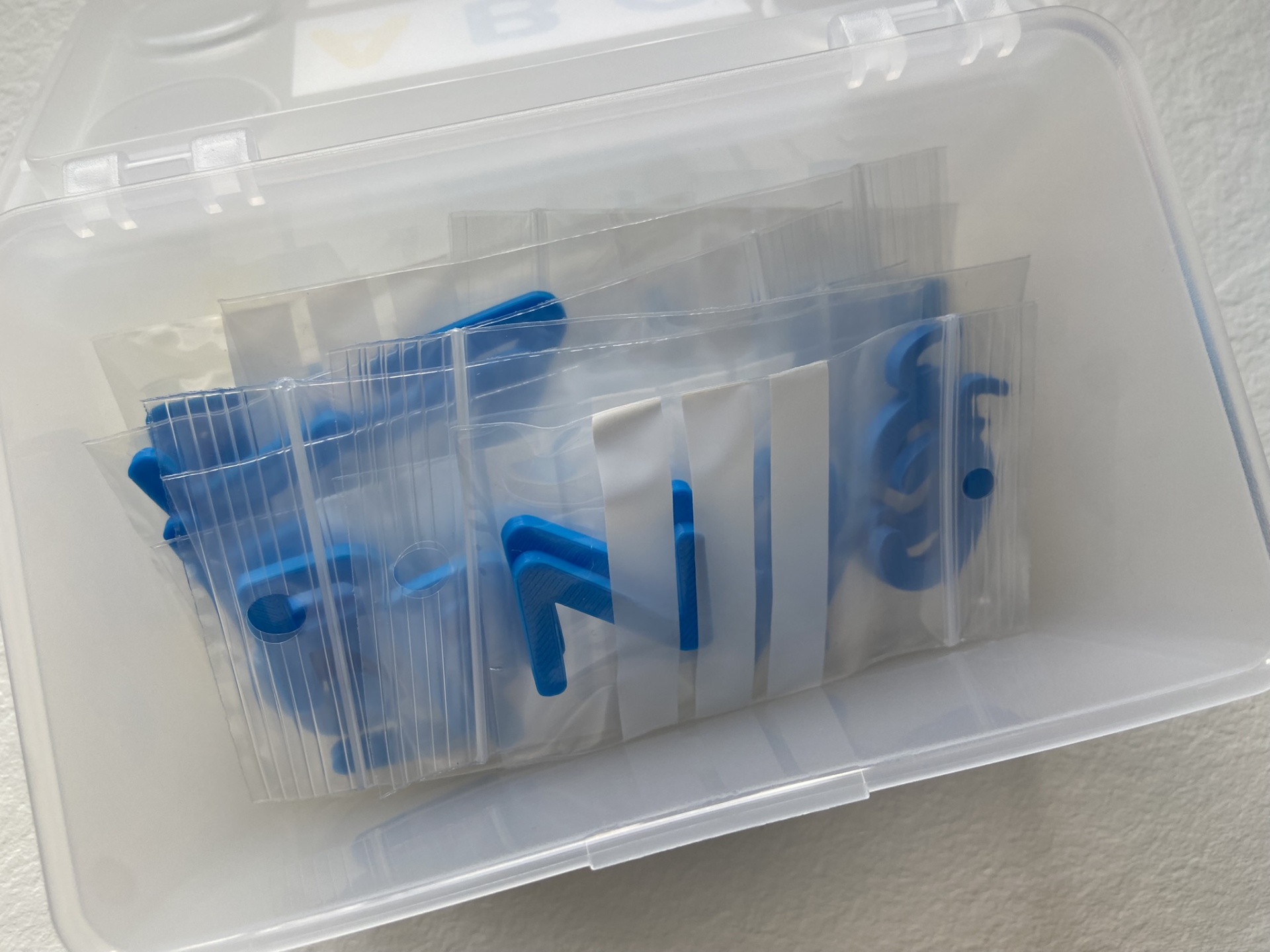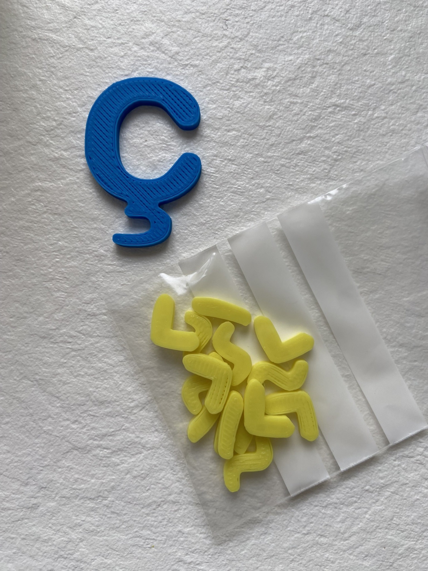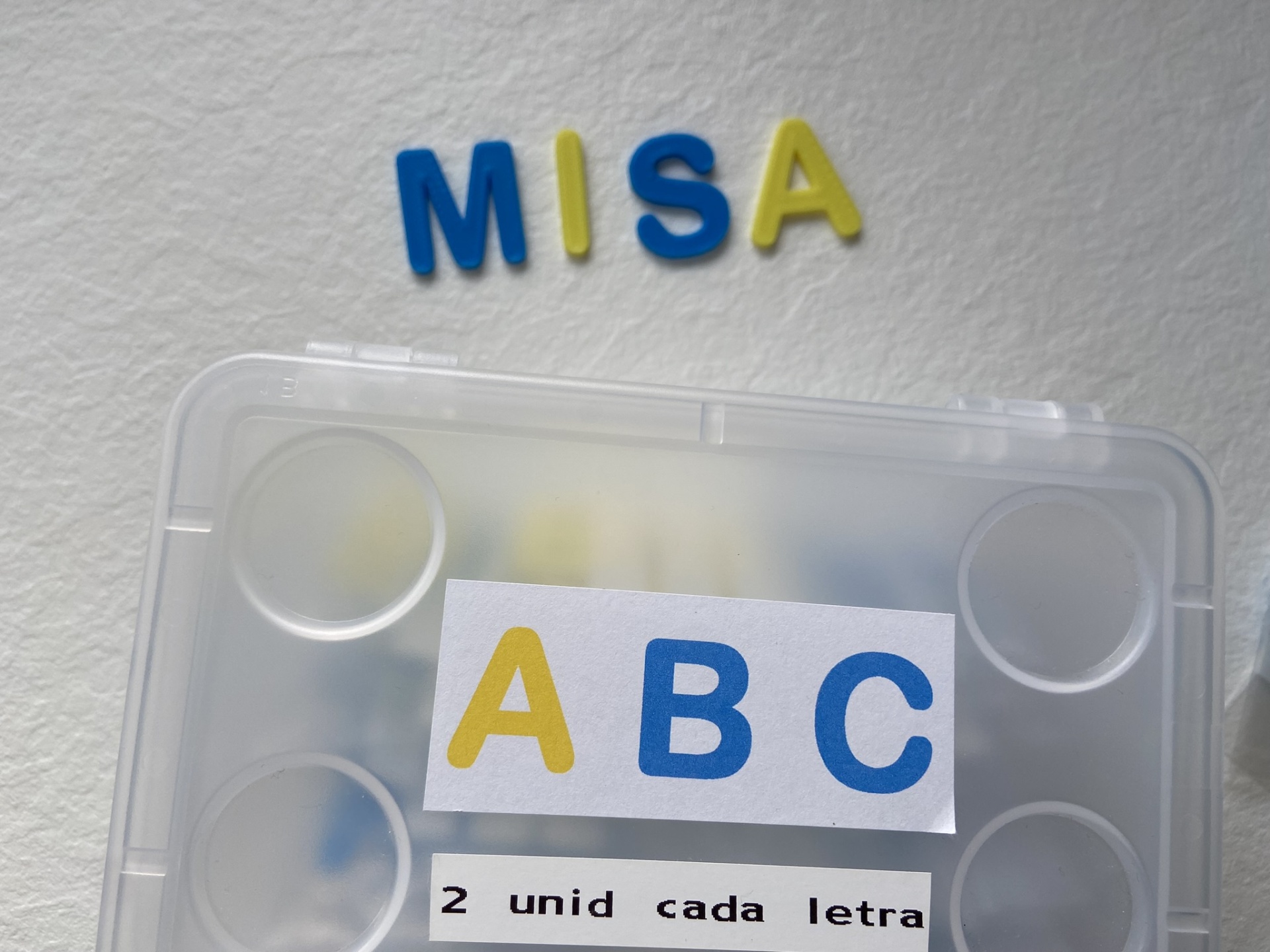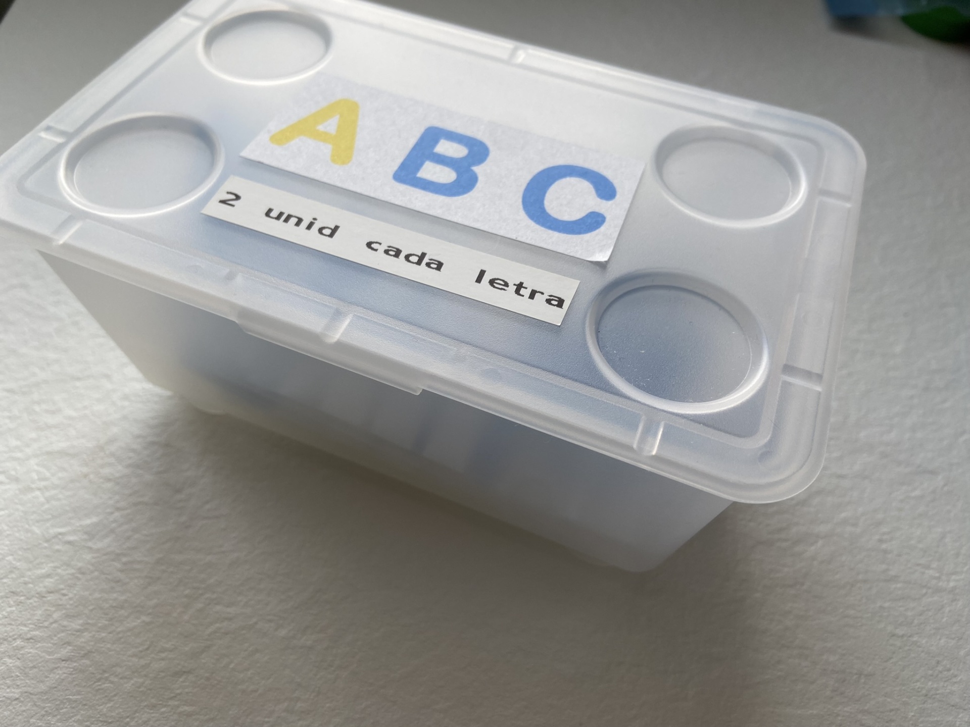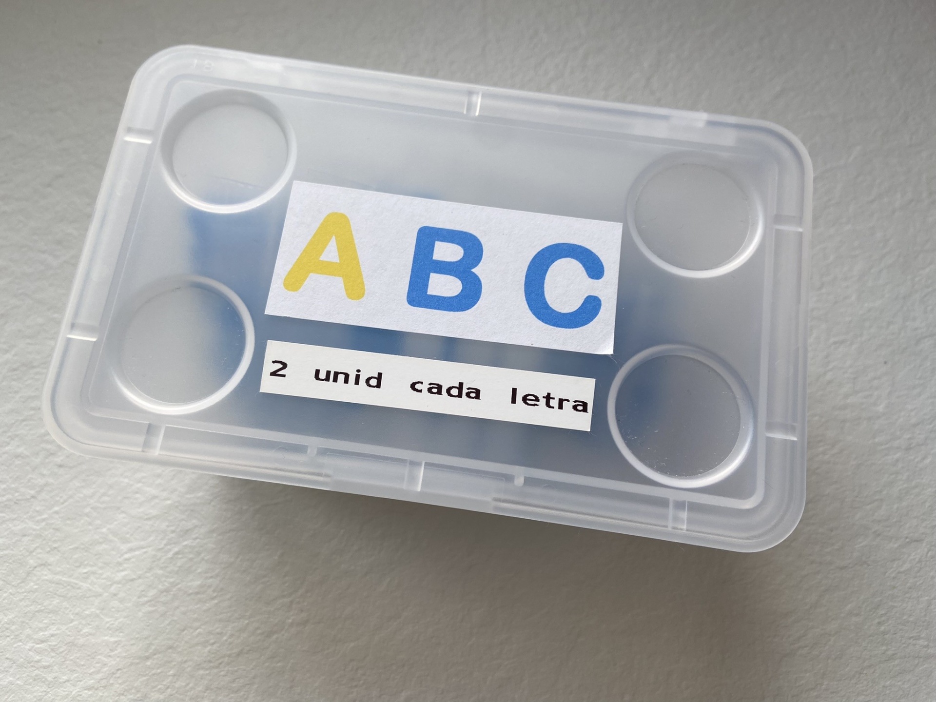 As letras estão organizadas em conjuntos de 2 letras iguais em sacos zip, enviados numa caixa.