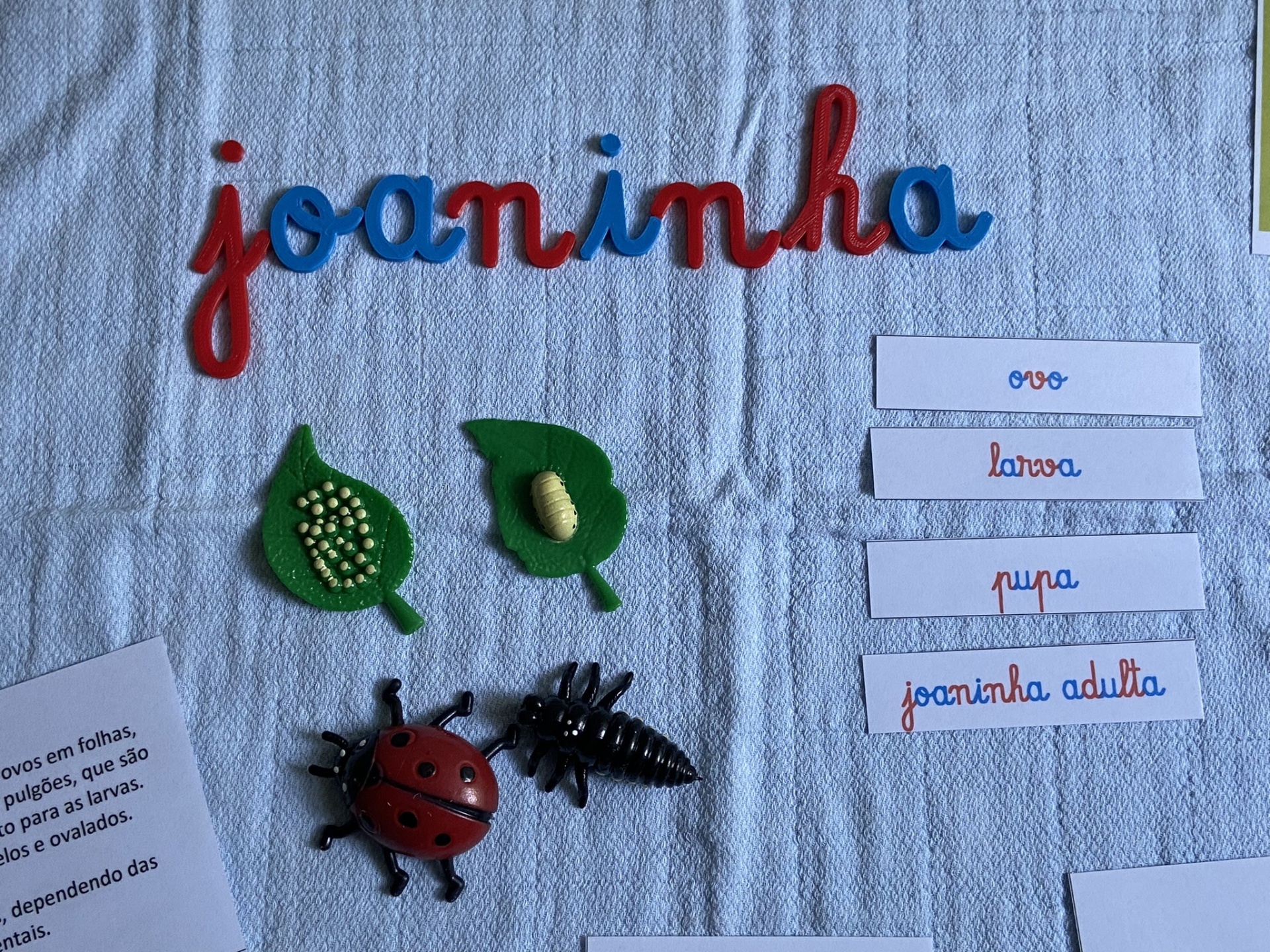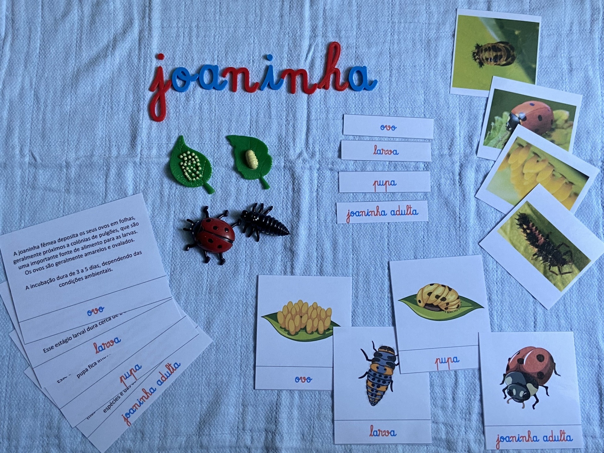Este kit inclui cartões informativos, figuras ilustrativas e letras temáticas "joaninha", proporcionando uma imersão completa no ciclo de vida destes pequenos seres.