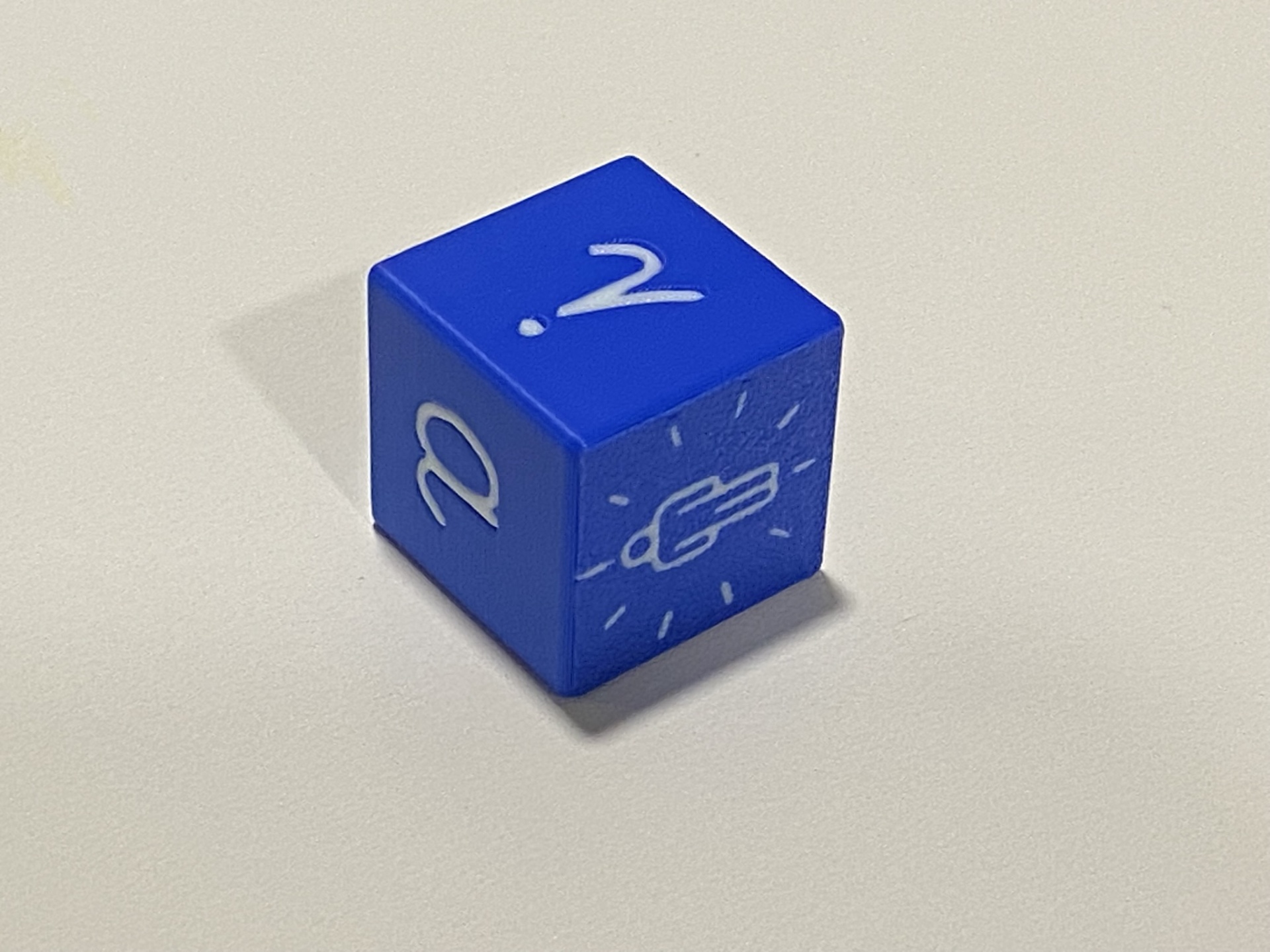 • Dado azul com números e símbolos brancos