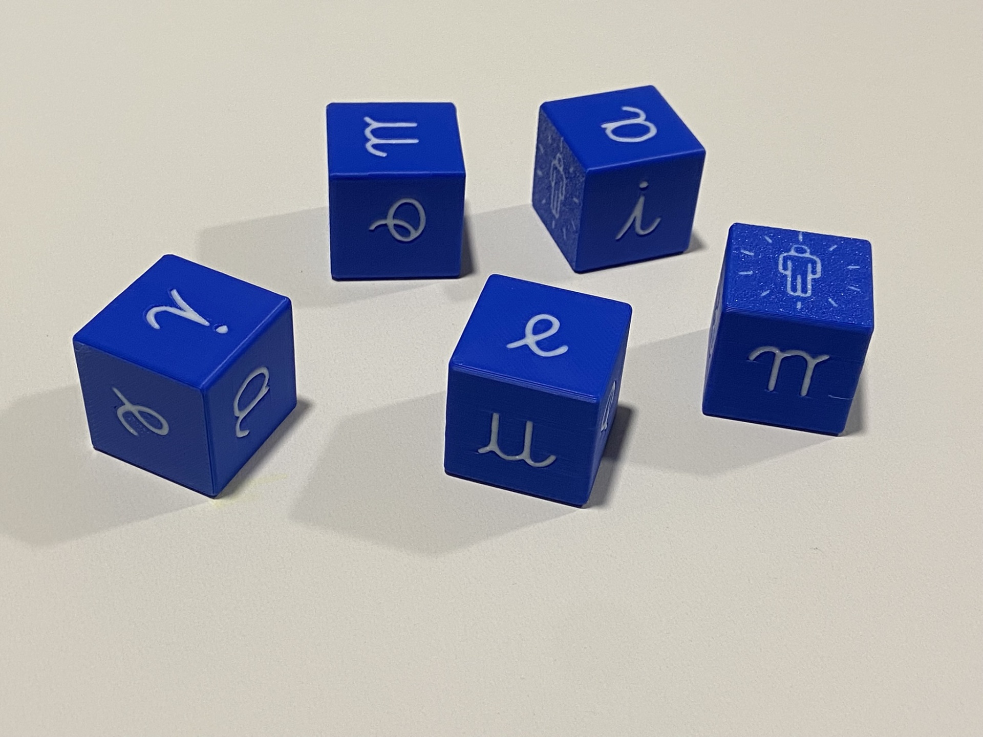 • Cinco dados azuis com símbolos brancos sobre fundo branco