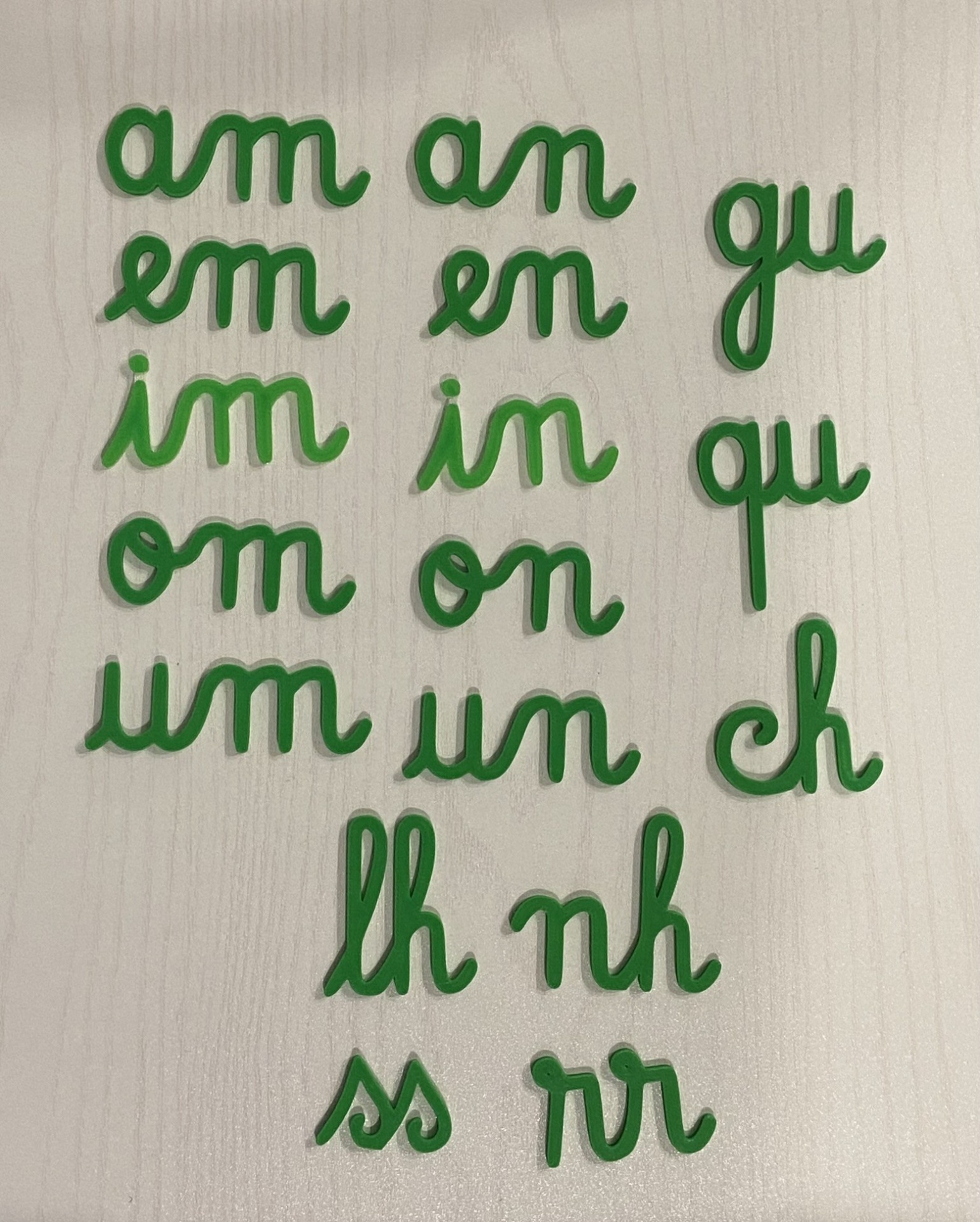 Dígrafos # verde # 2 unidades de cada 10,00 € Desconto de %. Partilhar Comprar Contactar Dígrafos am, an, em, en, im, in, om, on, um, un ch, ss, rr, lh, nh, gu, qu Este conjunto contém 2 unidades de cada dígrafo Cor: verde Disponível noutras cores, basta contactar por email loja.misa.3d@gmail.com Medidas: "a" mede 2,5 cm de altura As pintas dos i estão unidas numa peça única, com cor transparente no verso. - Este tipo de letra é o mesmo dos nossos alfabetos móveis cursivos - Material: PLA O PLA (ácido polilático) é um material biodegradável e sustentável, derivado de fontes renováveis - como o amido de milho.
