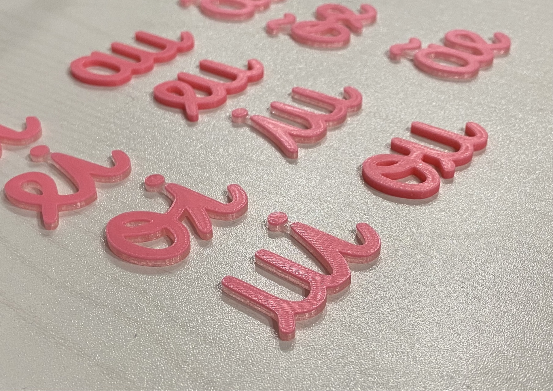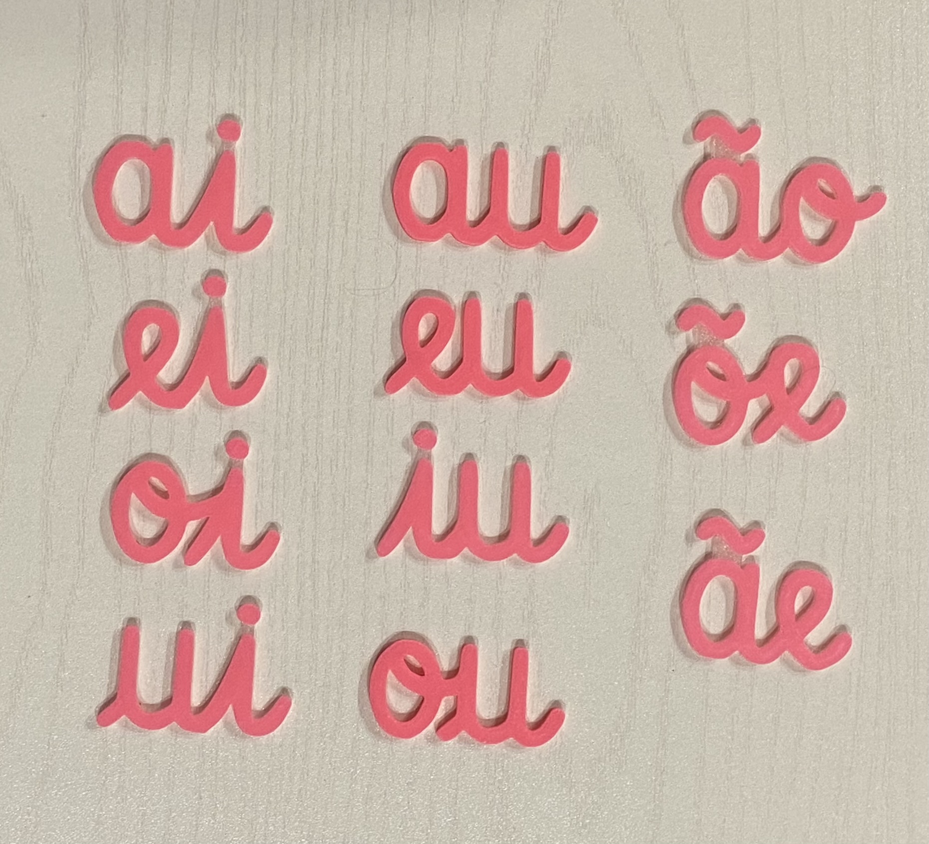 Ditongos # cor de rosa # 1 unidade de cada 3,75 € Desconto de %. Partilhar Comprar Contactar Ditongos ai, ãe, au, ão, ei, eu, iu, õe, oi, ou, ui Este conjunto contém 1 unidade de cada ditongo Cor: cor de rosa Disponível noutras cores, basta contactar por email loja.misa.3d@gmail.com Medidas: "a" mede 2,5 cm de altura Os acentos e a pinta do i estão unidos numa peça única, com cor transparente no verso. - Este tipo de letra é o mesmo dos nossos alfabetos móveis cursivos - Material: PLA O PLA (ácido polilático) é um material biodegradável e sustentável, derivado de fontes renováveis - como o amido de milho.