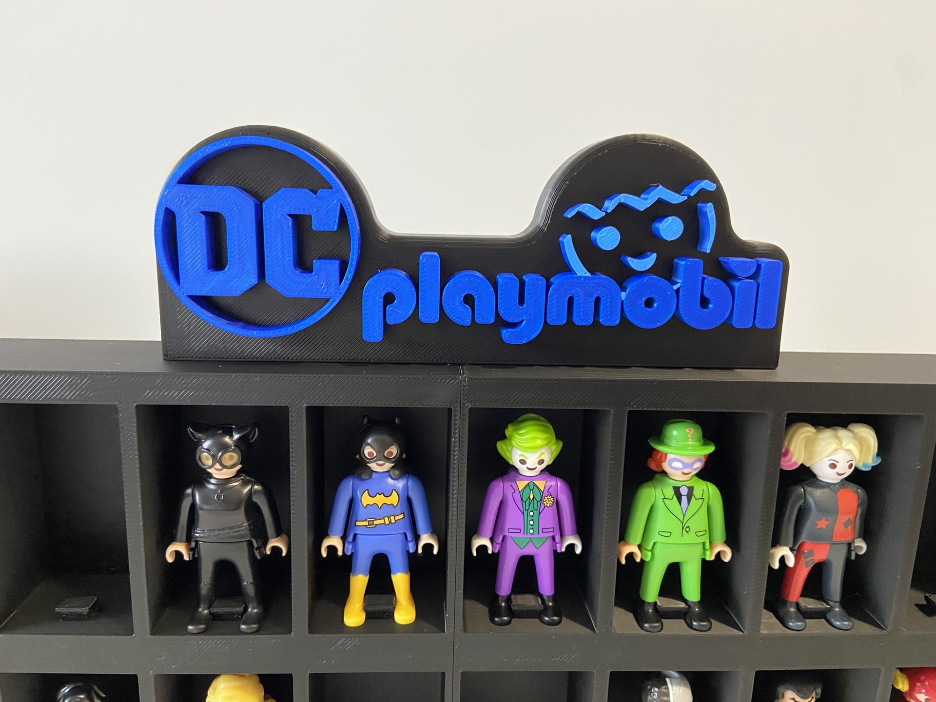 • Figuras Playmobil DC Comics Catwoman Batgirl Joker Riddler Harley Quinn na prateleira com letreiro DC playmobil
