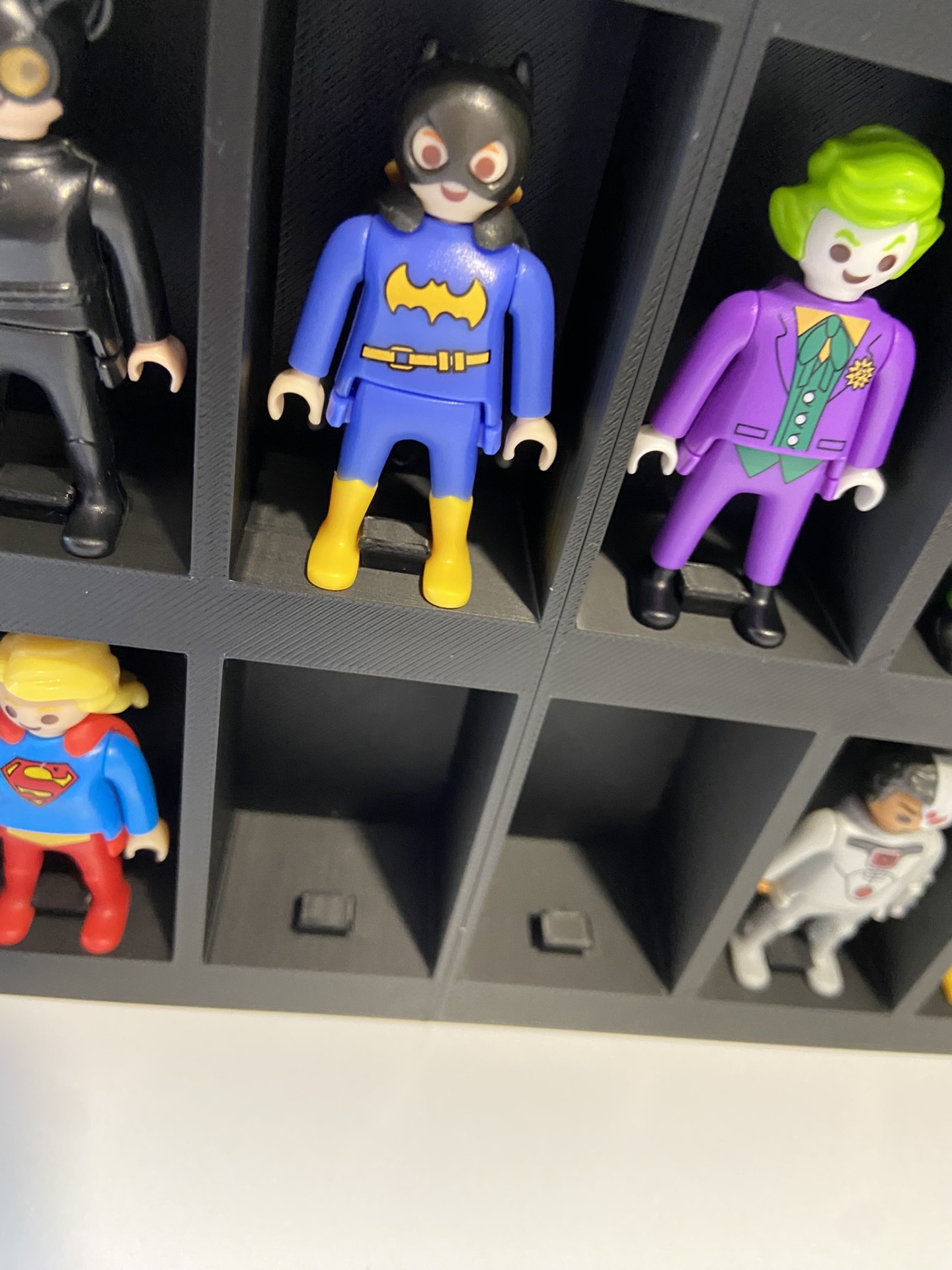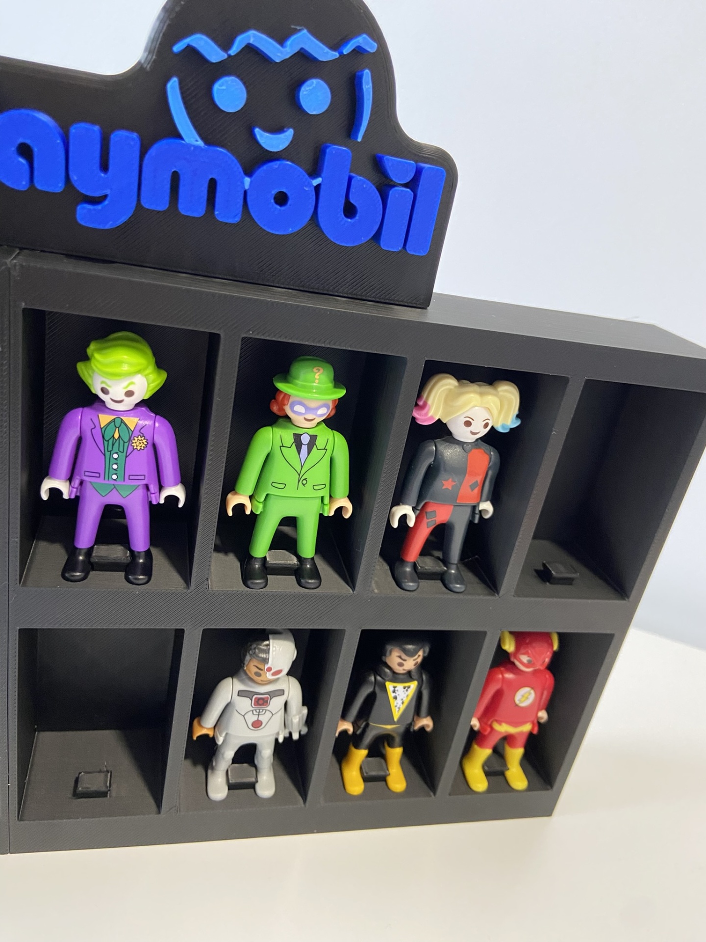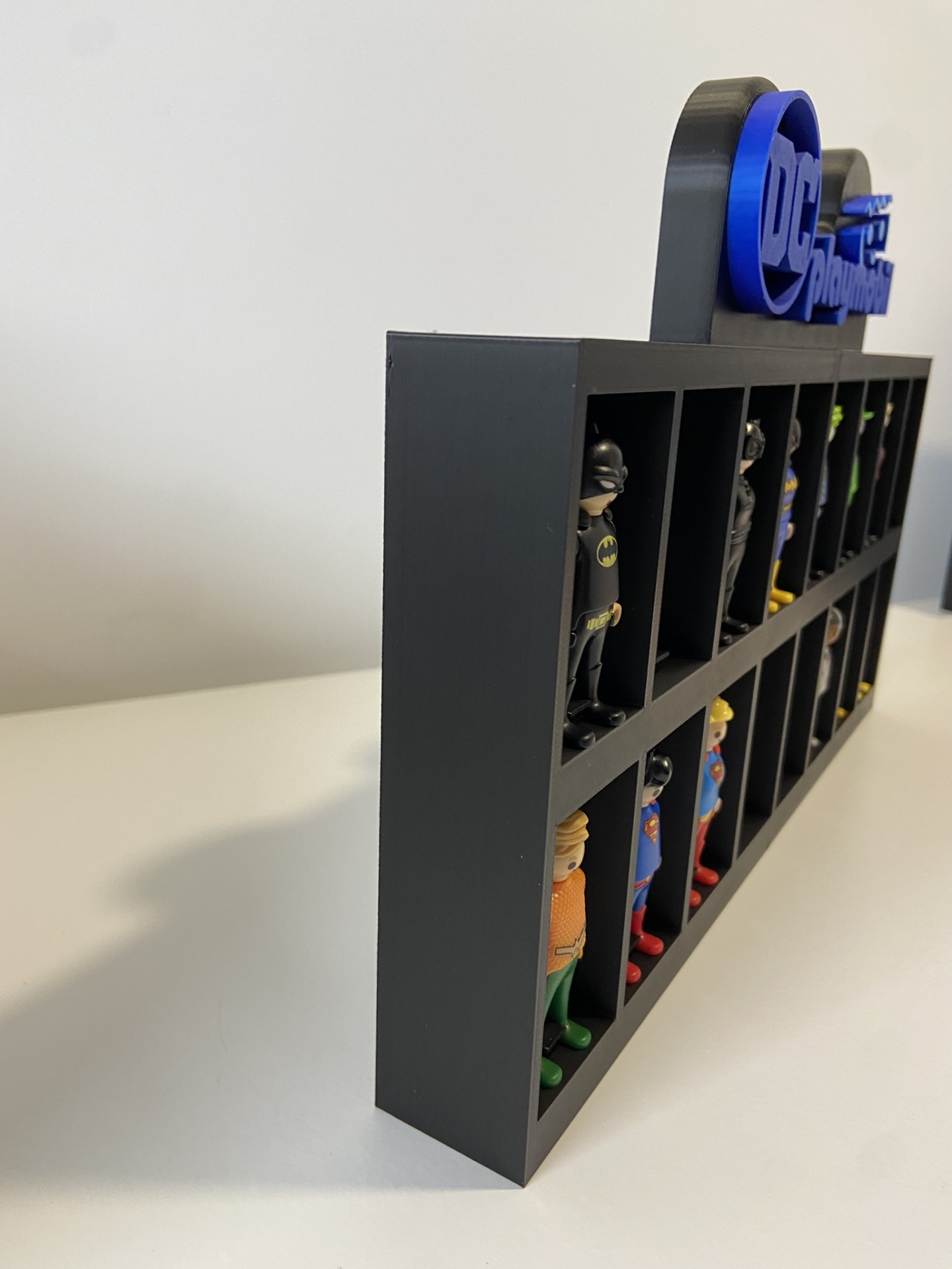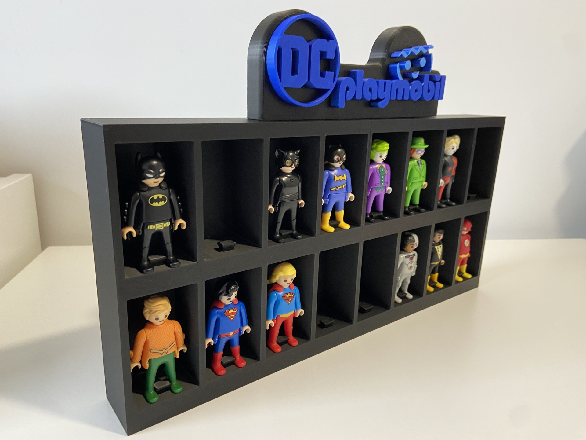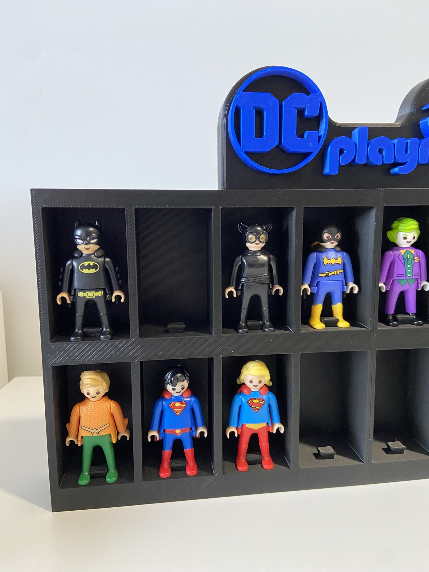 • Expositor preto com figuras Playmobil DC organizadas em compartimentos