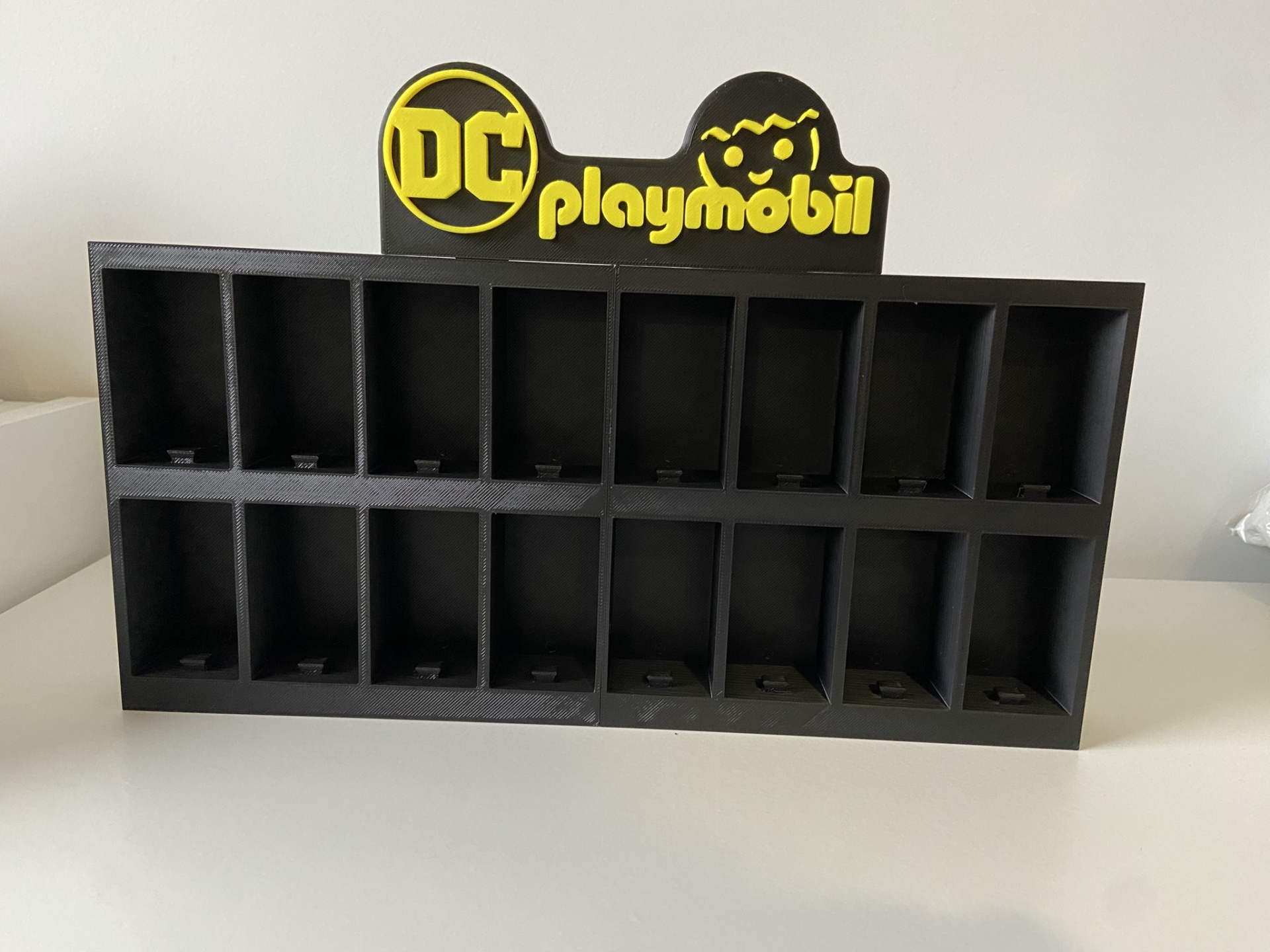 Expositor preto com 14 compartimentos e logótipo amarelo DC playmobil