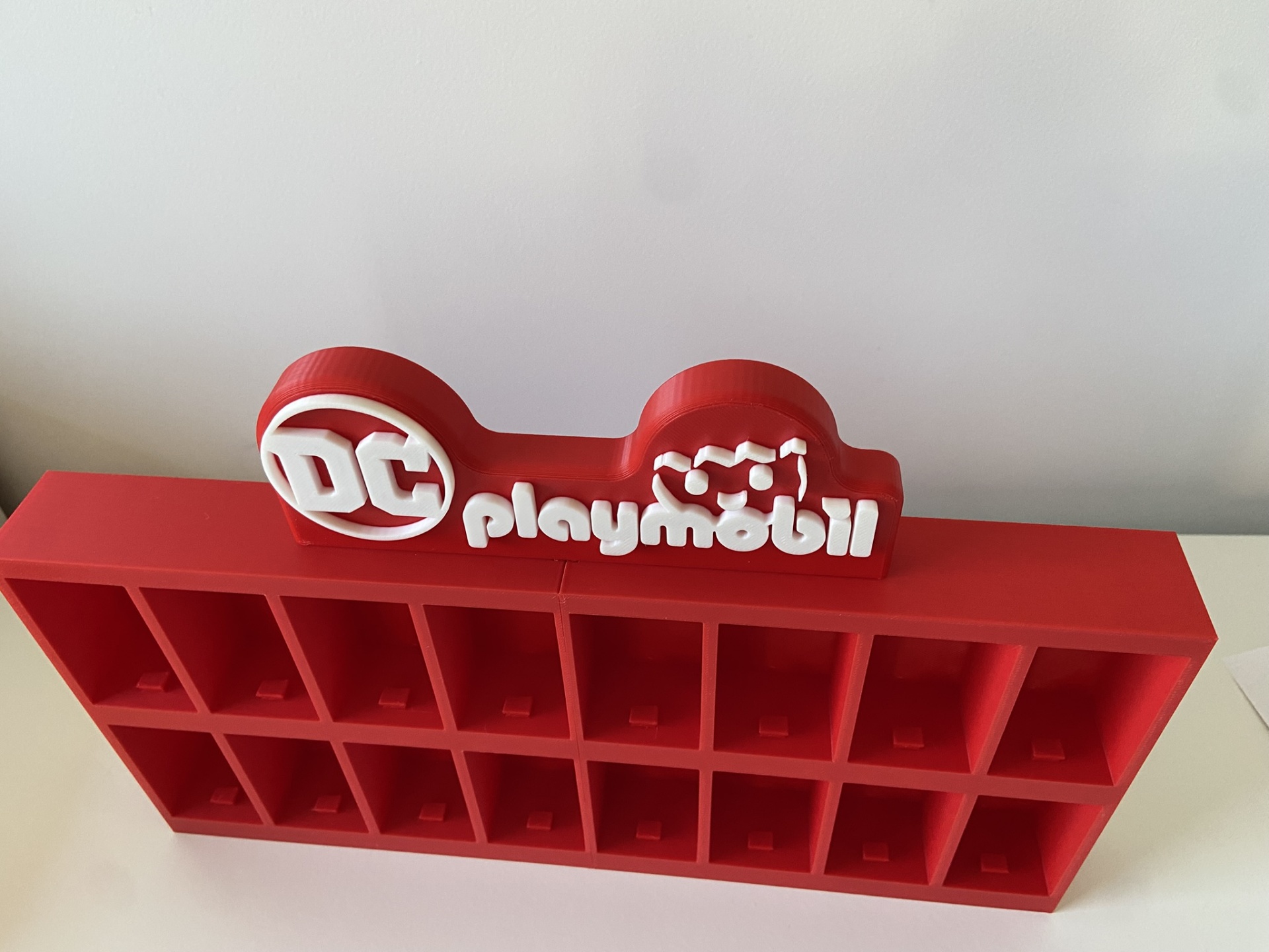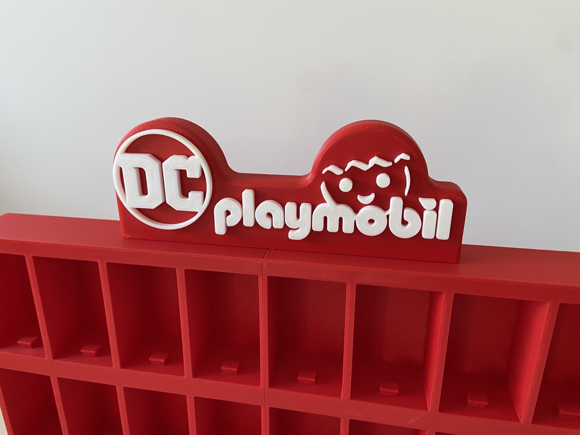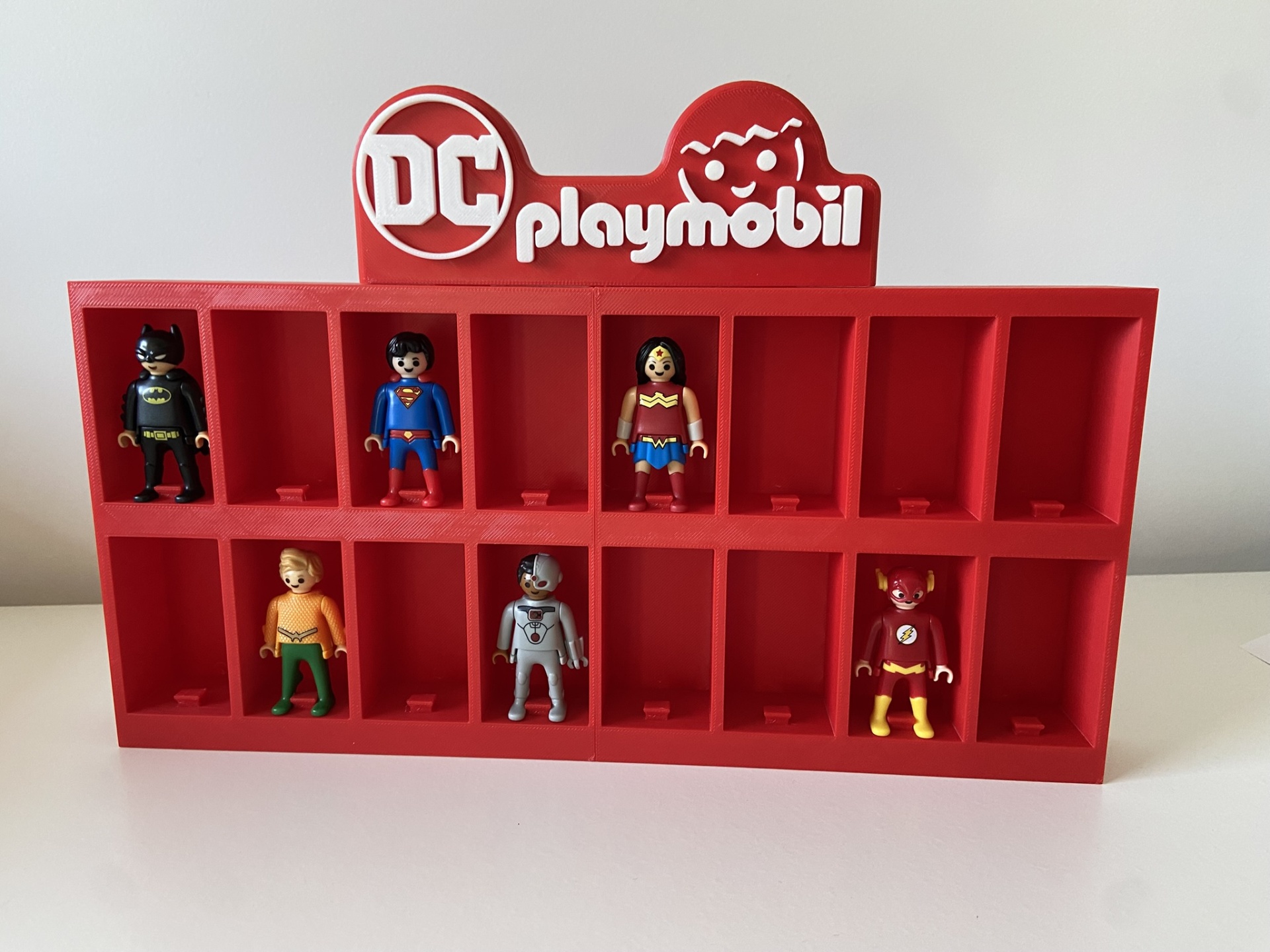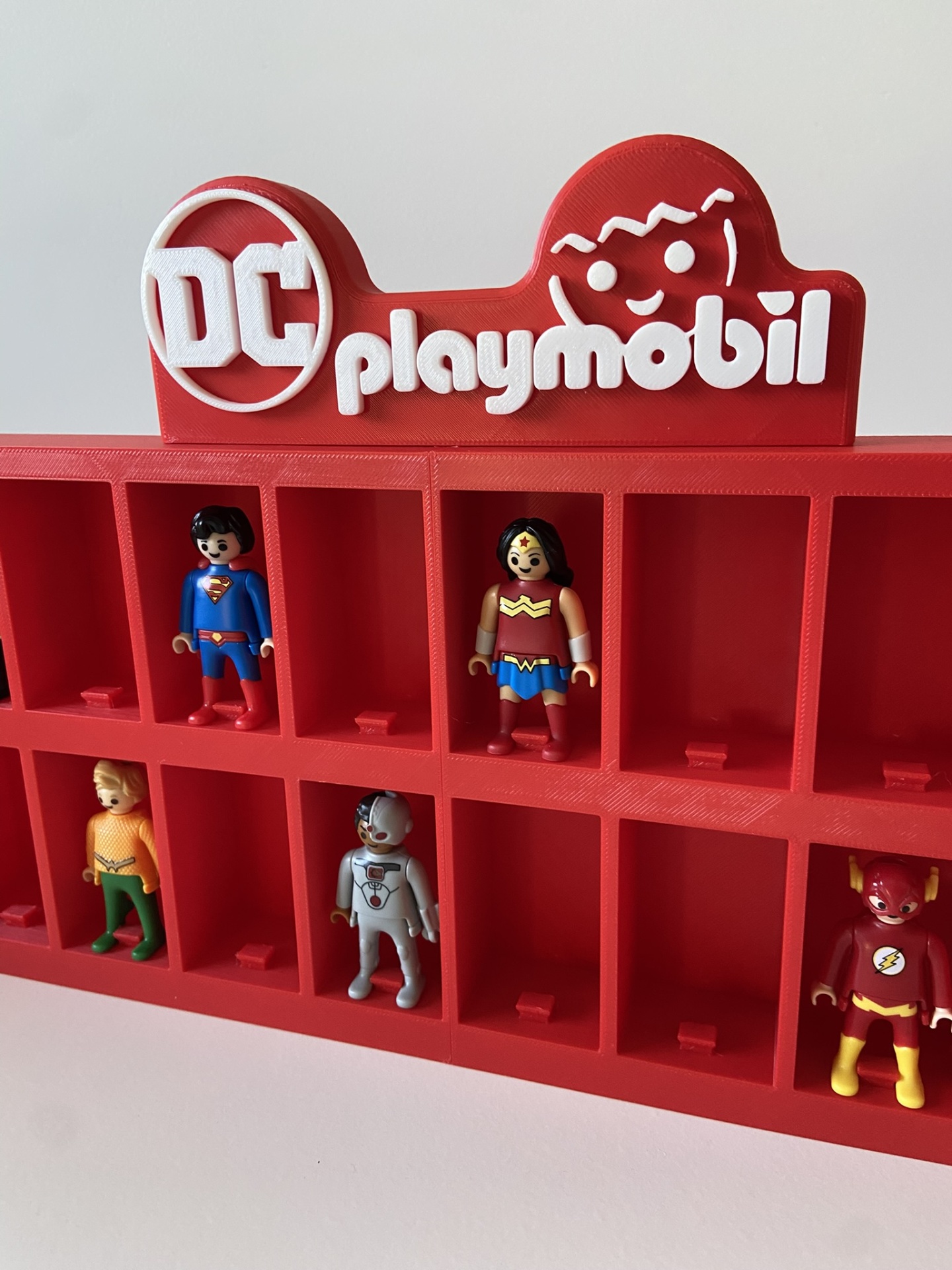 • Expositor vermelho para figuras Playmobil com texto DC playmobil