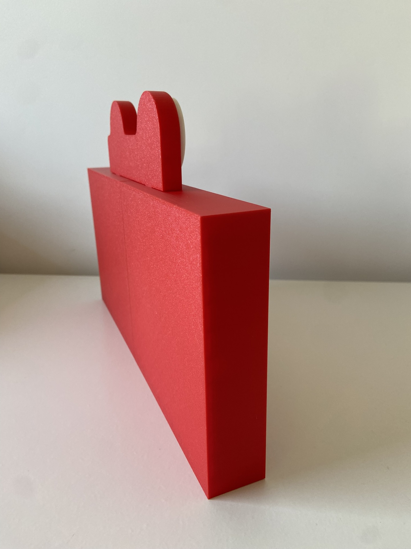 • Bloco vermelho retangular com topo curvo em duas elevações, em superfície branca