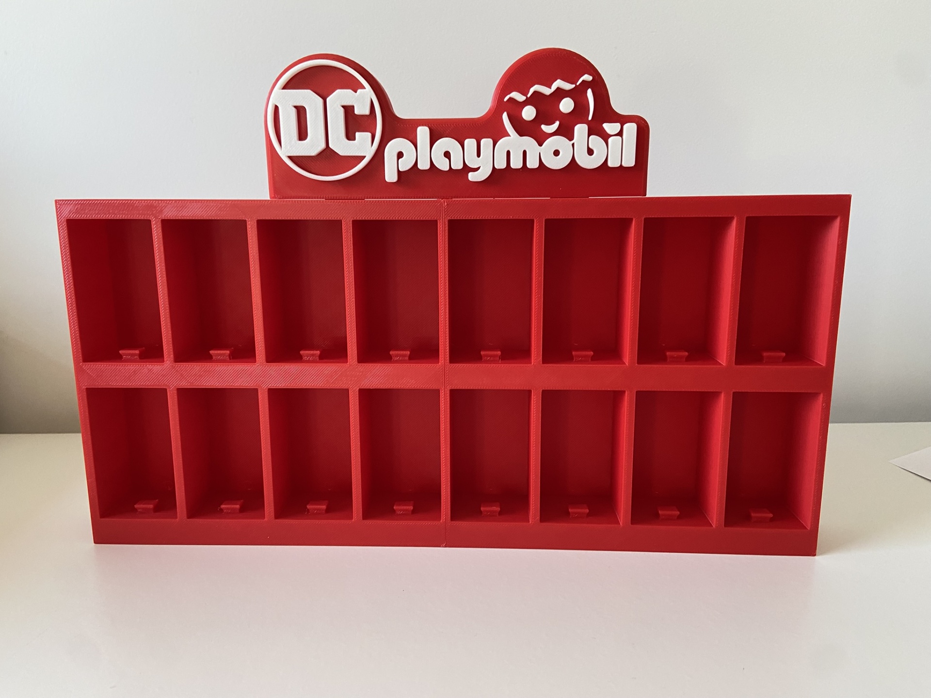 • Expositor vermelho de plástico com 16 compartimentos e logótipo DC playmobil em branco