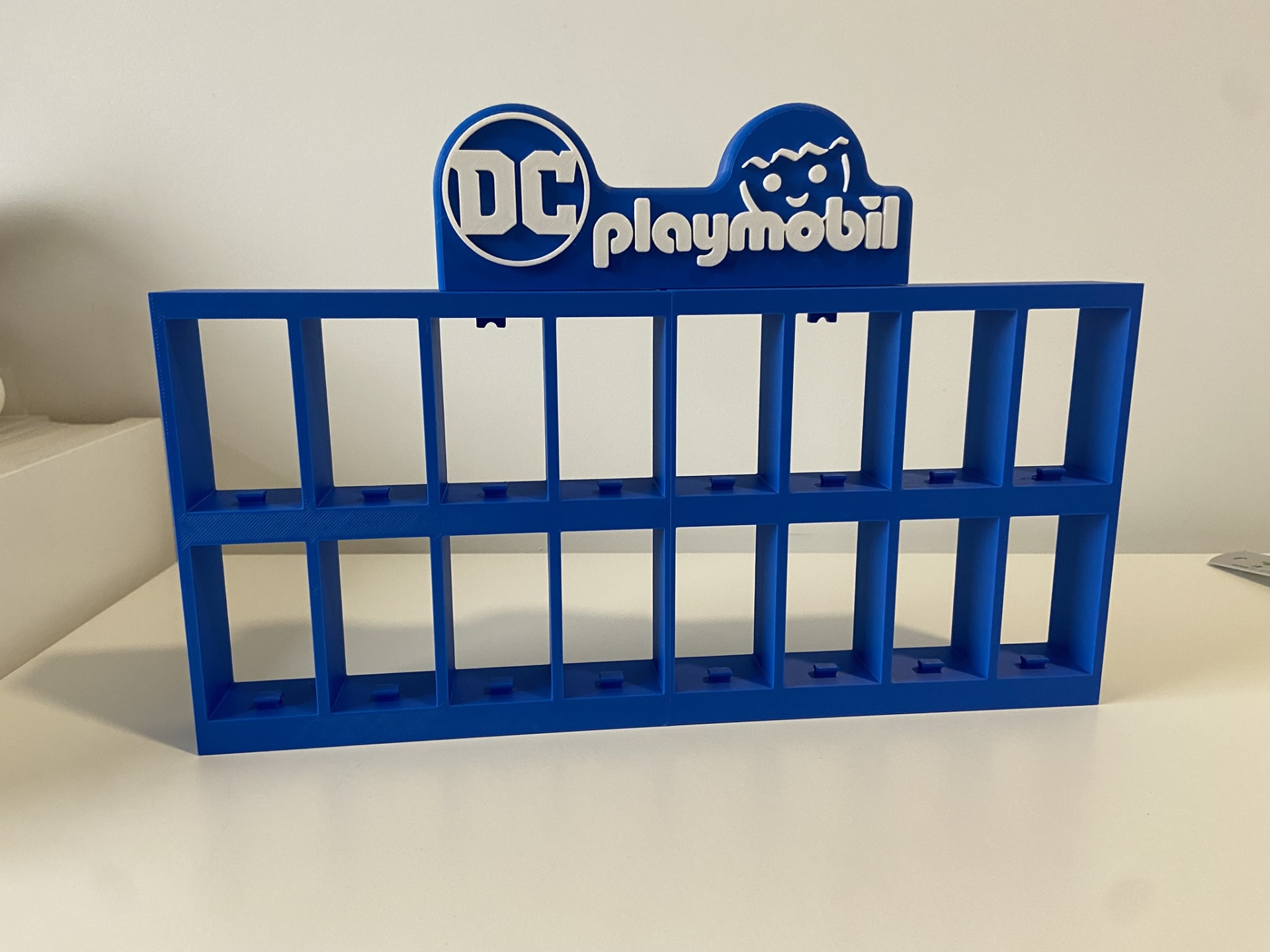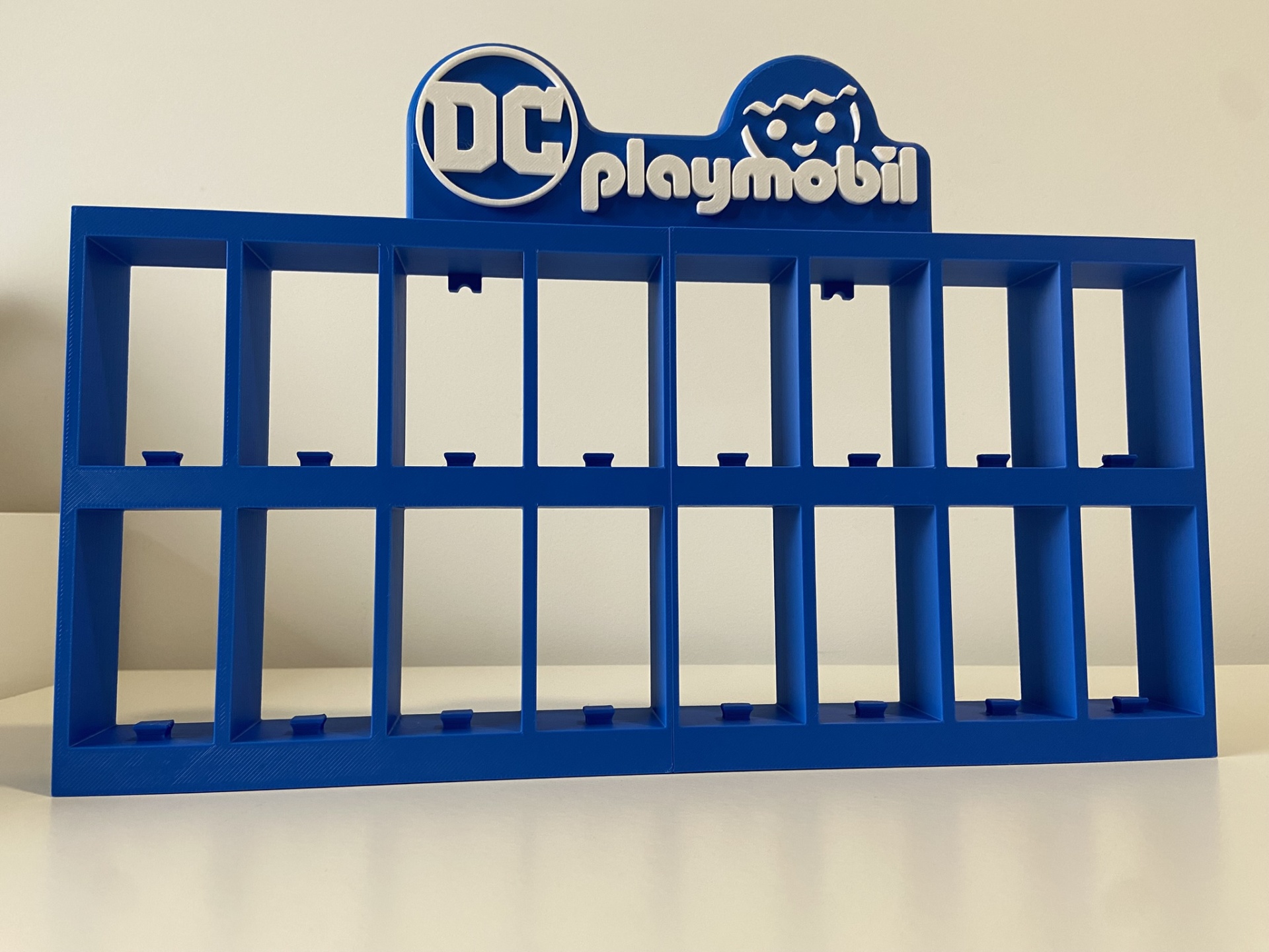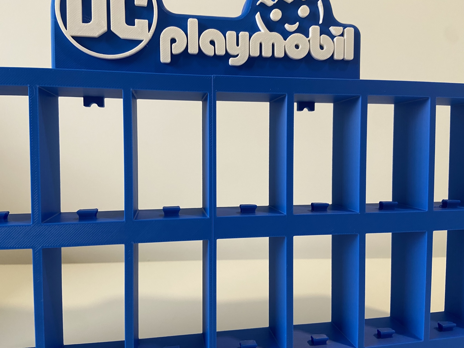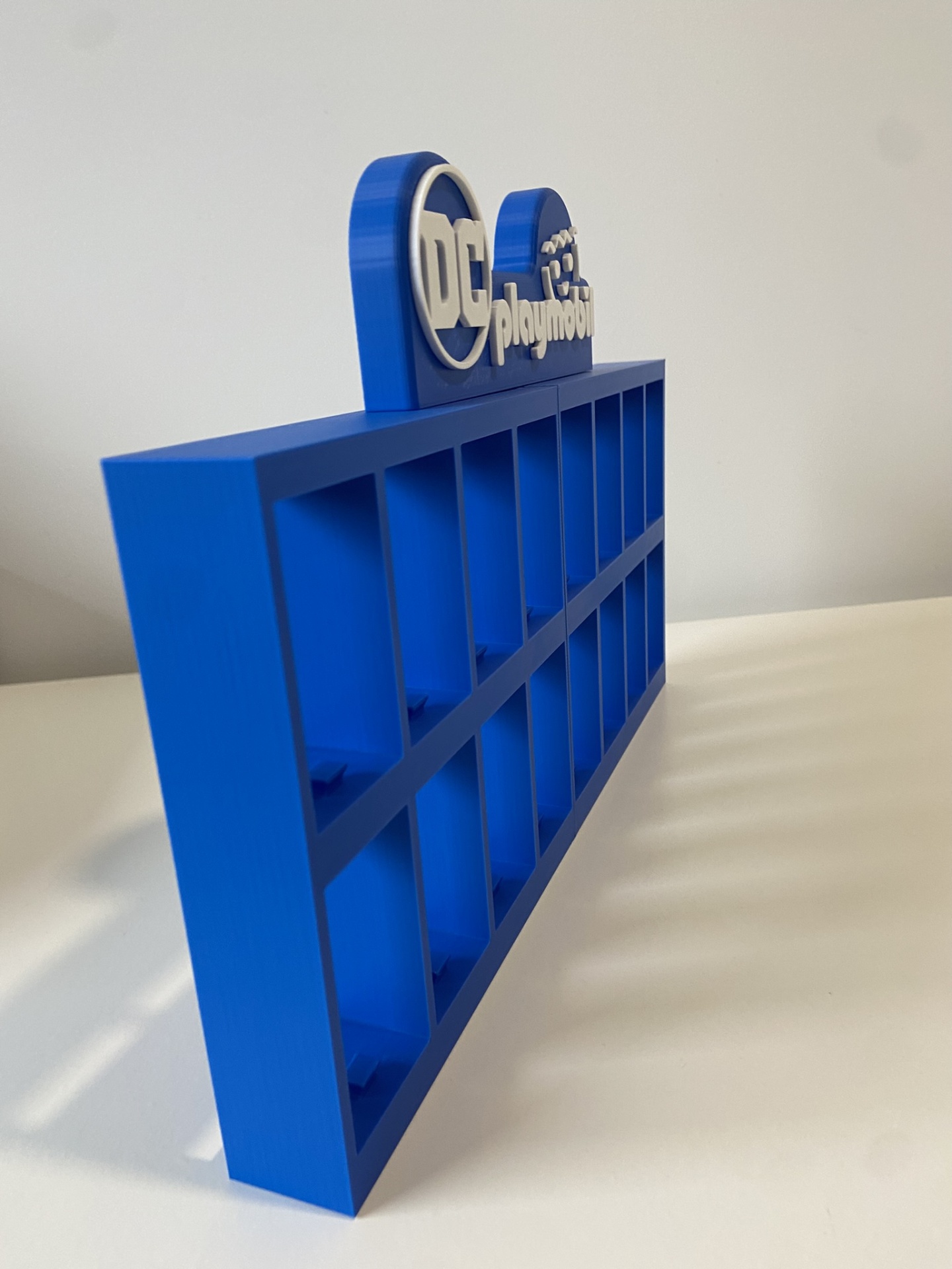 • Expositor azul para figuras Playmobil DC com compartimentos quadrados.