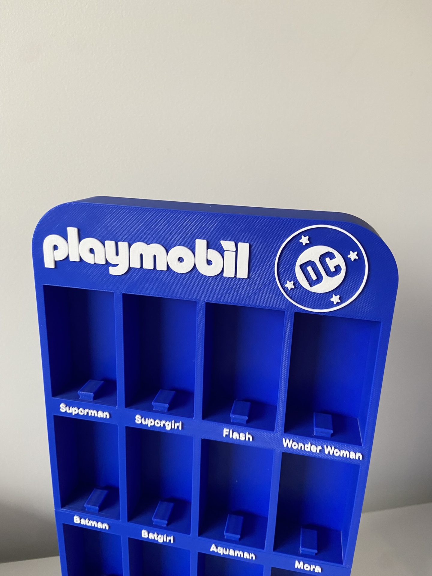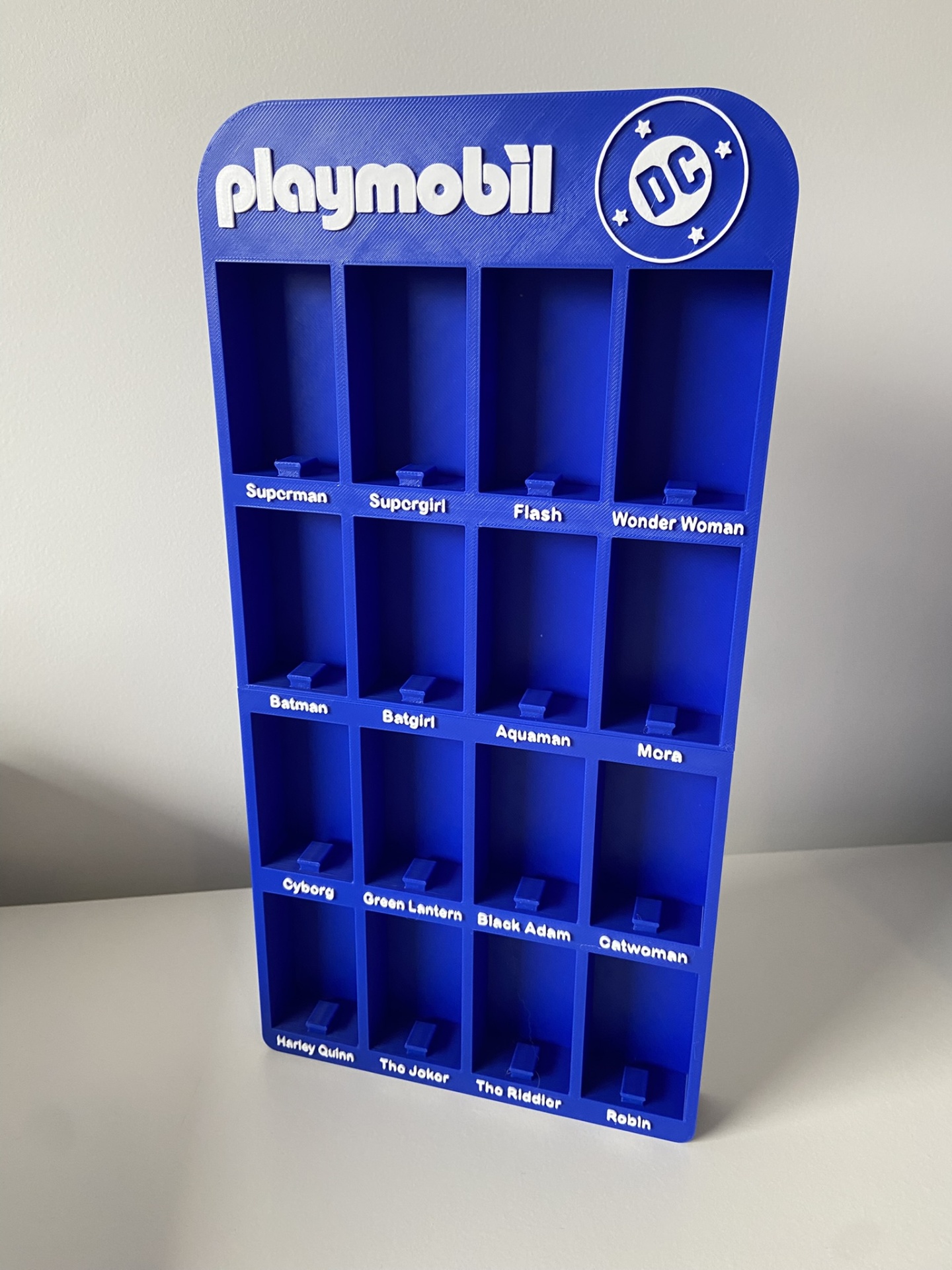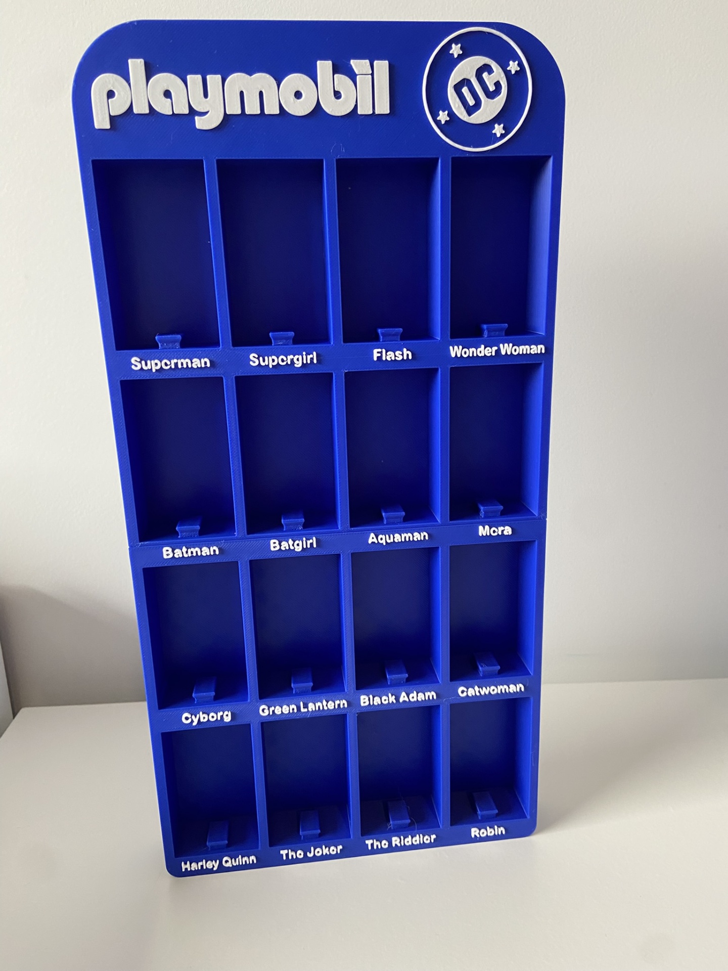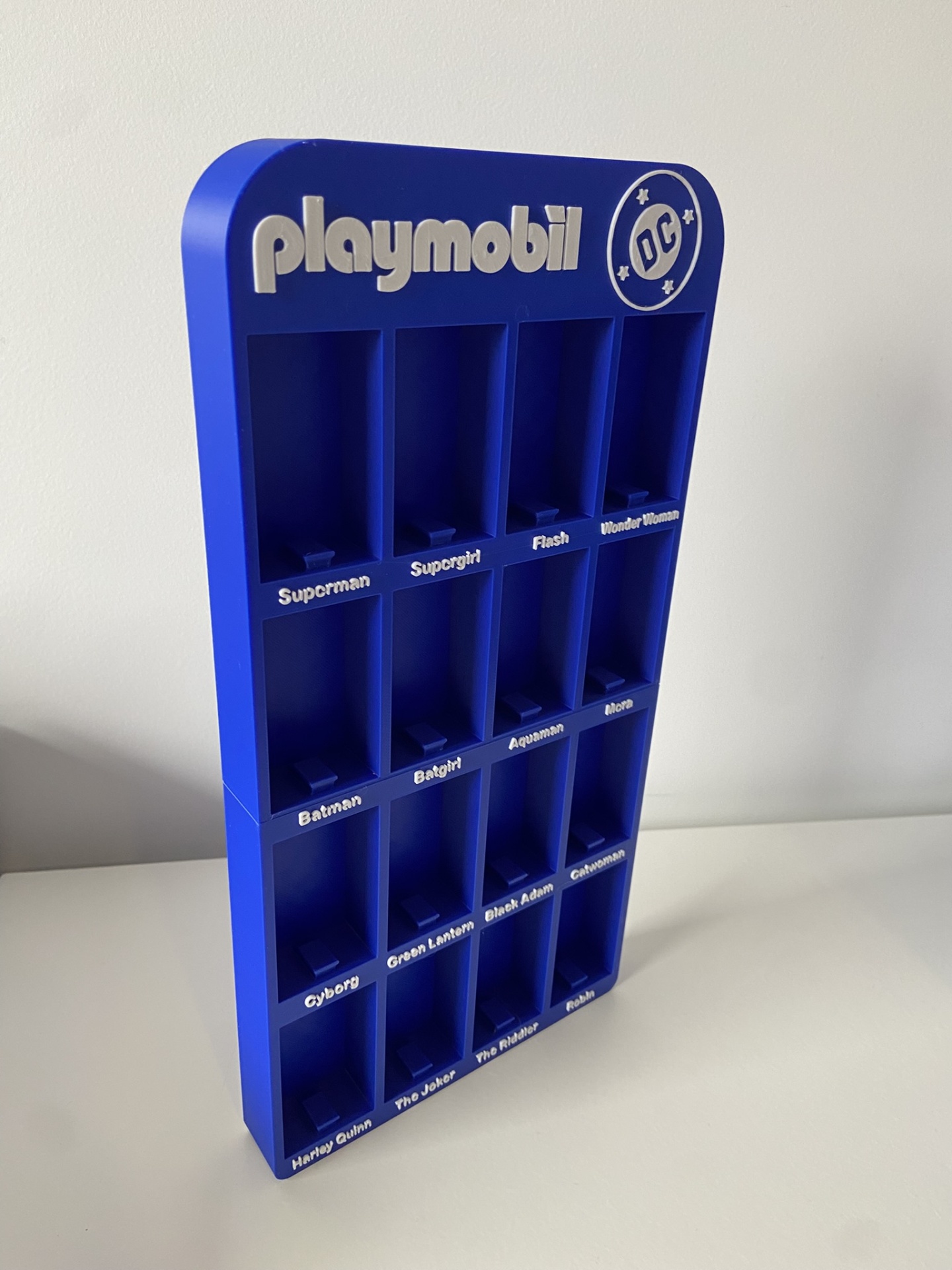 Suporte azul Playmobil DC para figuras com 16 compartimentos rotulados.