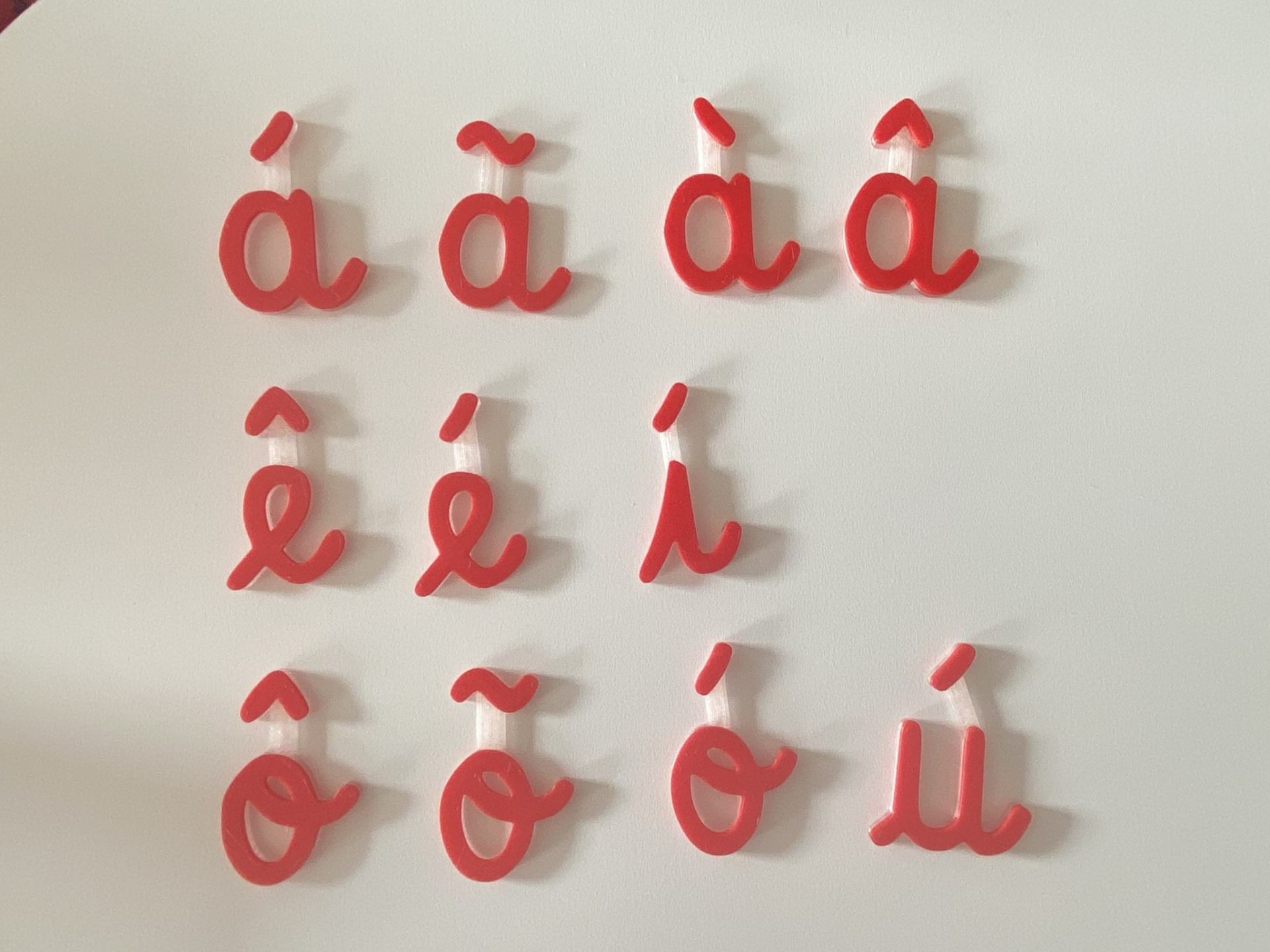 Letras com acentos # 2 unidades de cada 5,00 € Desconto de %. Partilhar O produto encontra-se sem stock. Letras com acentos Este conjunto contém 2 unidades de cada Cor: Vermelho Disponível noutras cores, basta contactar por email loja.misa.3d@gmail.com Medidas: "a" mede 2,5 cm de altura Os acentos estão unidos numa peça única, com cor transparente no verso. - Este tipo de letra é o mesmo dos nossos alfabetos móveis cursivos - Material: PLA O PLA (ácido polilático) é um material biodegradável e sustentável, derivado de fontes renováveis - como o amido de milho.