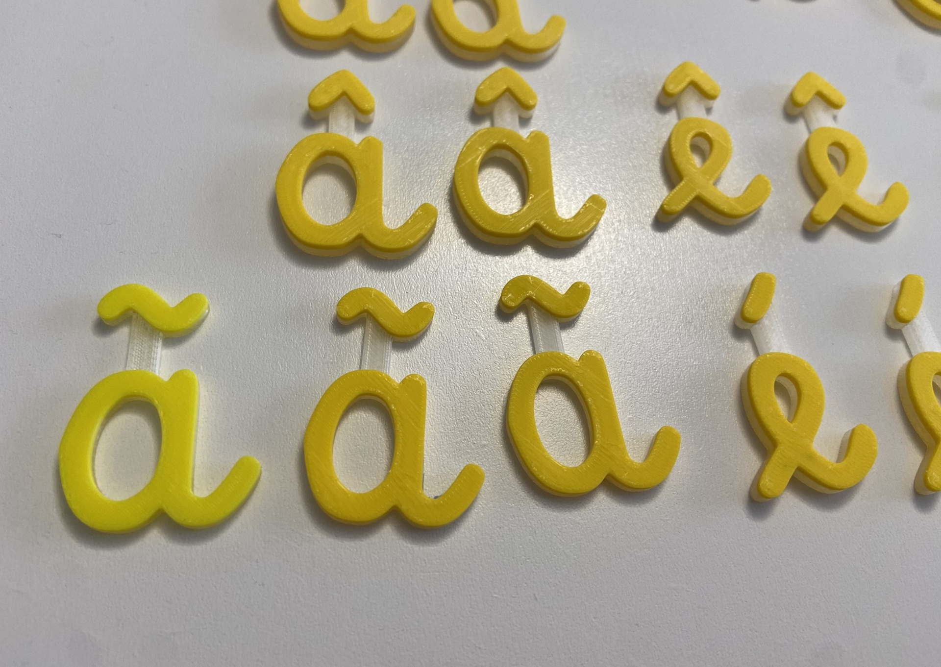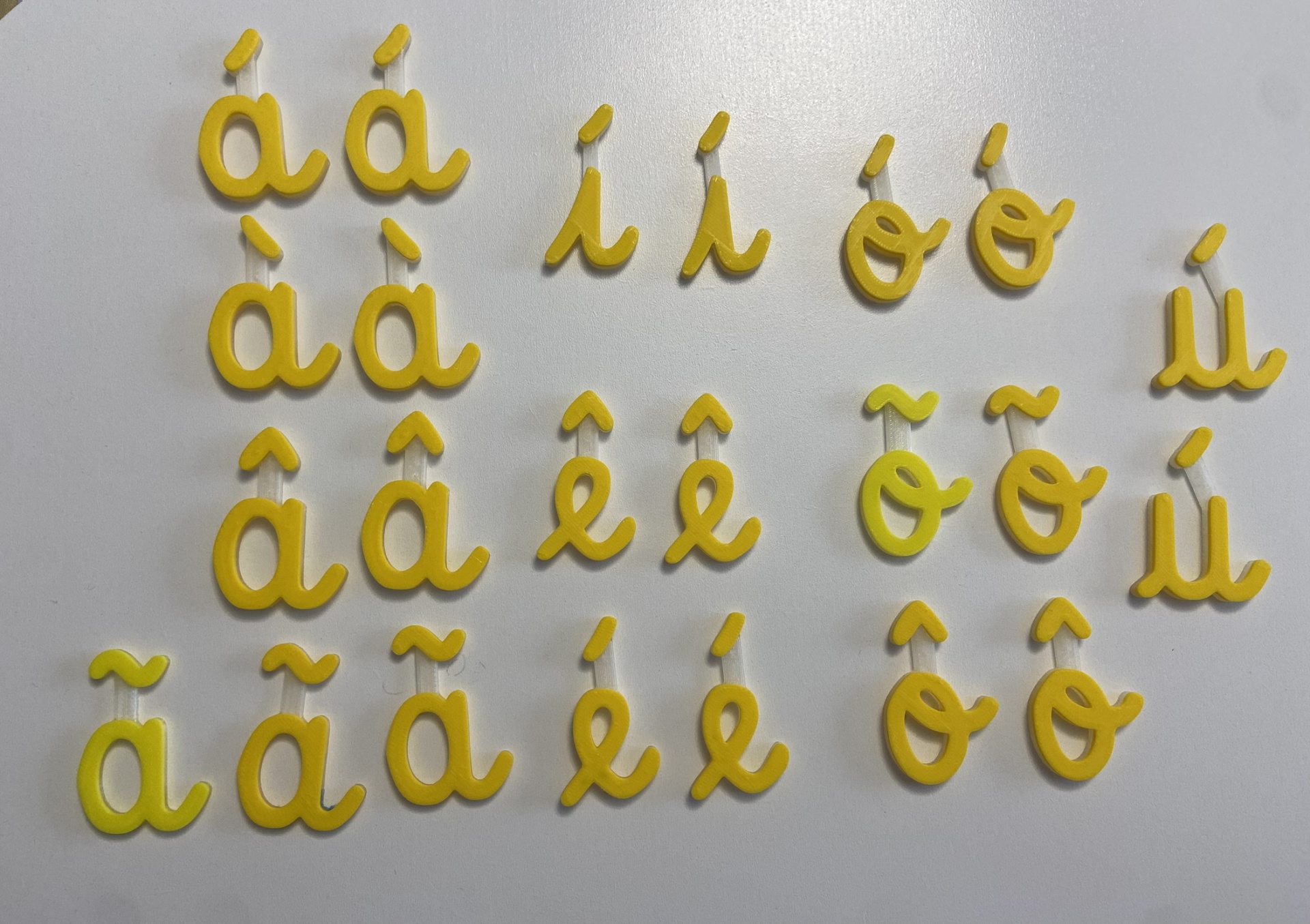 Letras com acentos # 2 unidades de cada # Amarelo # Kit único 4,50 € Desconto de %. Partilhar O produto encontra-se sem stock. Letras com acentos Este conjunto contém 2 unidades de cada Cor: amarelo (2 tons) Medidas: "a" mede 2,5 cm de altura Os acentos estão unidos numa peça única, com cor transparente no verso. - Este tipo de letra é o mesmo dos nossos alfabetos móveis cursivos - Material: PLA O PLA (ácido polilático) é um material biodegradável e sustentável, derivado de fontes renováveis - como o amido de milho. # ref. 261 #