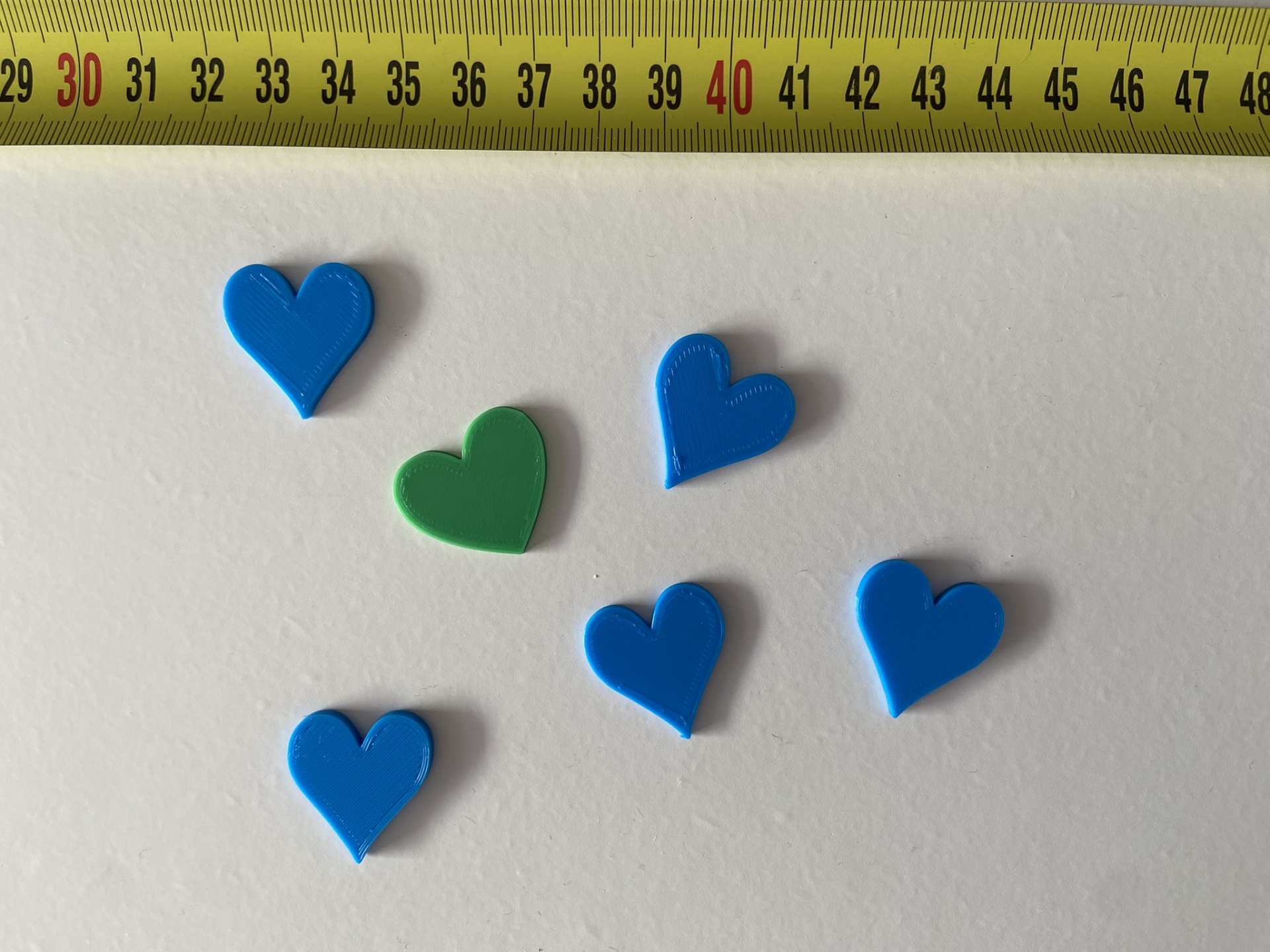 • Seis corações de plástico azuis e verdes perto de uma fita métrica amarela