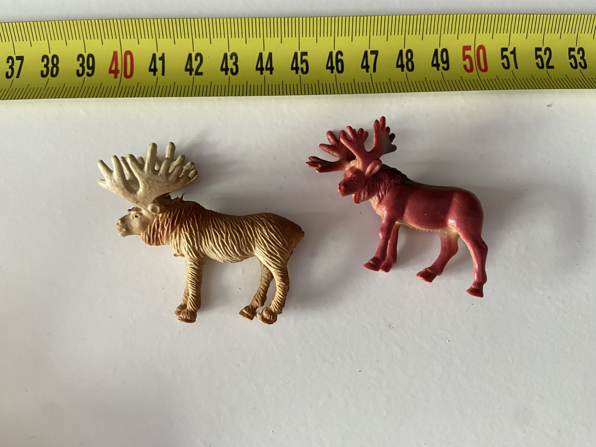 • Dois pequenos bonecos de alce em plástico, castanho e vermelho, ao lado de uma fita métrica.