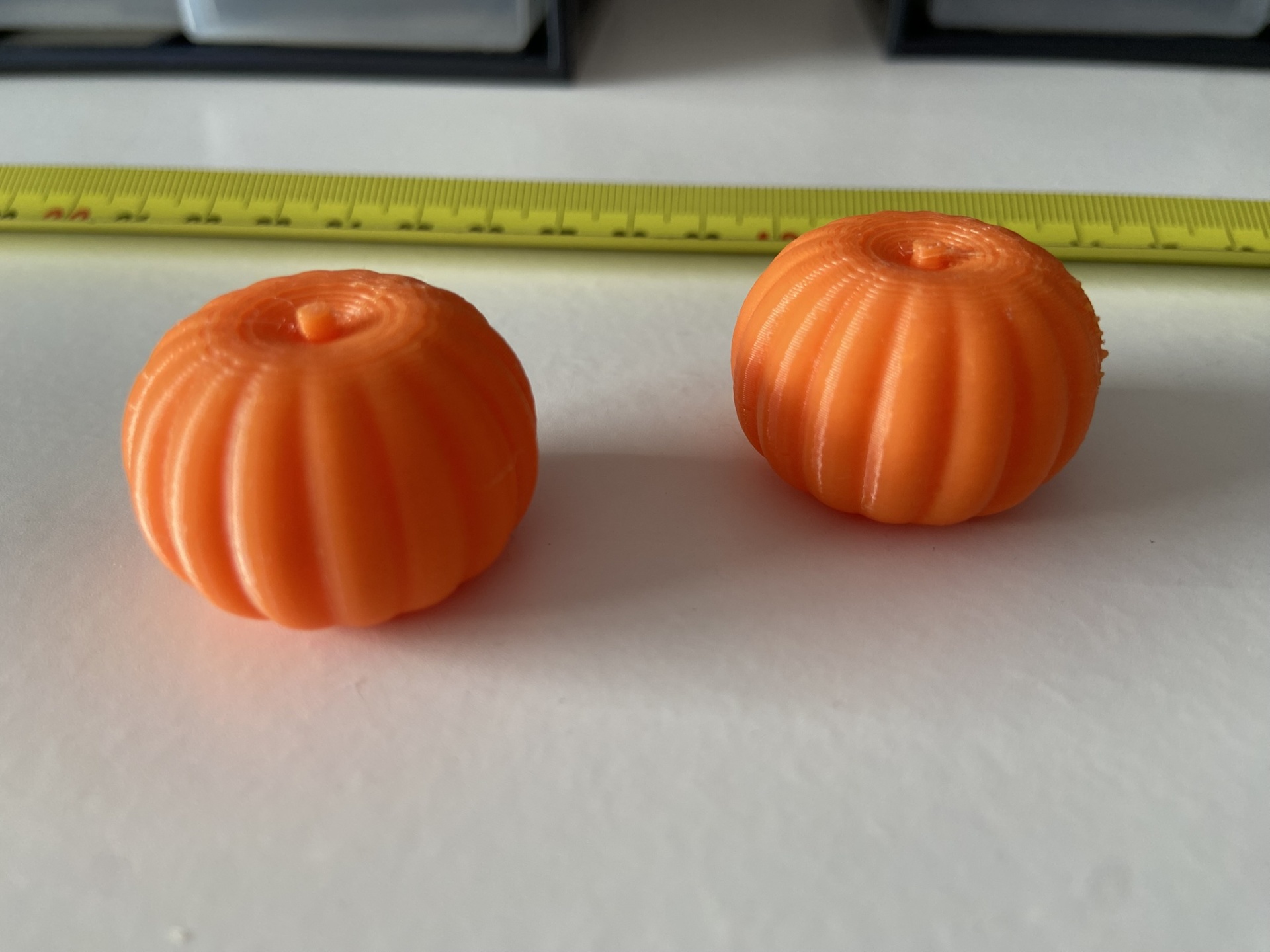 • Dois objetos laranja canelados em formato arredondado sobre mesa branca com fita métrica ao fundo