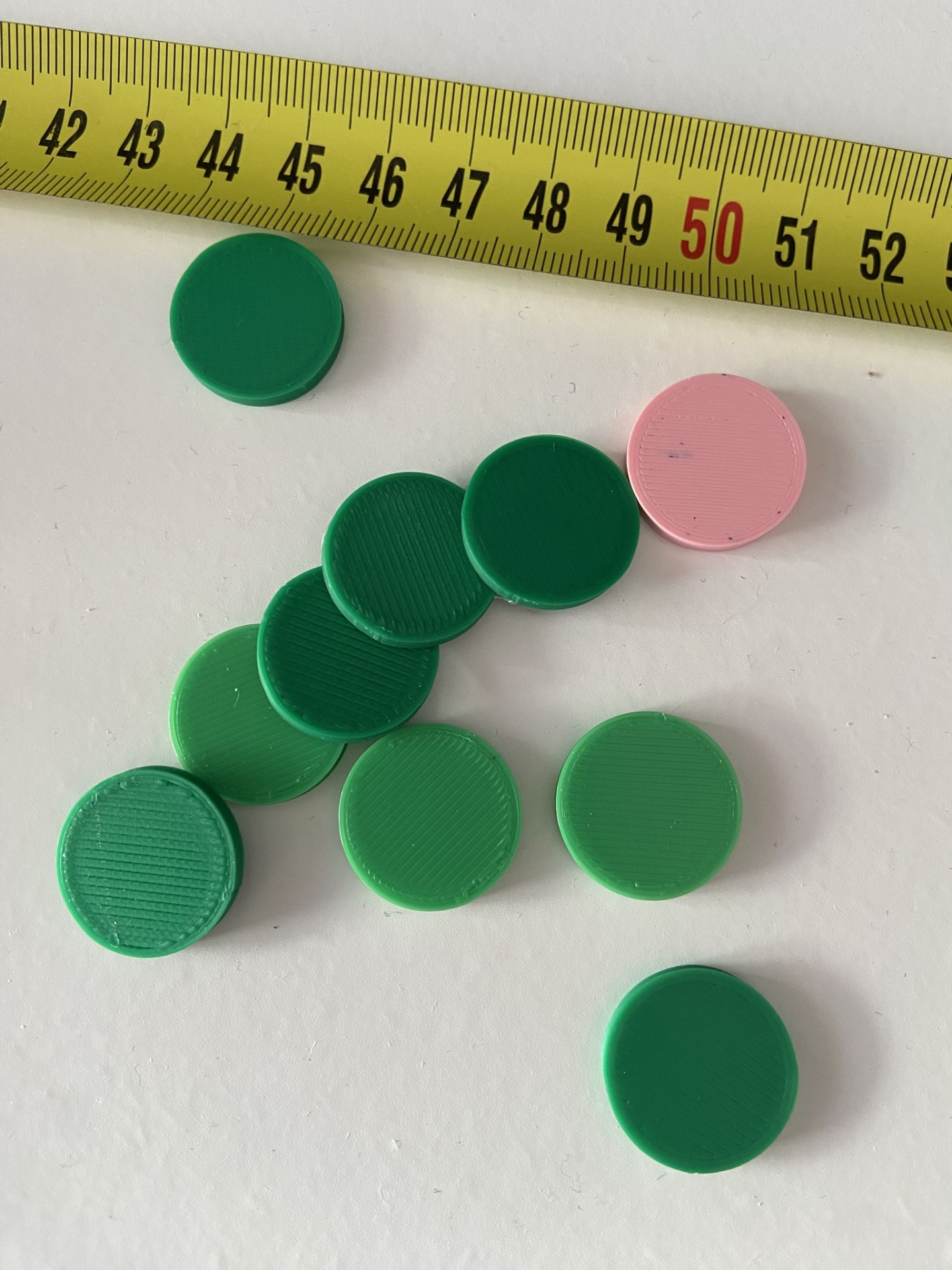 • Peças redondas planas verdes e rosa claro em superfície branca com fita métrica amarela