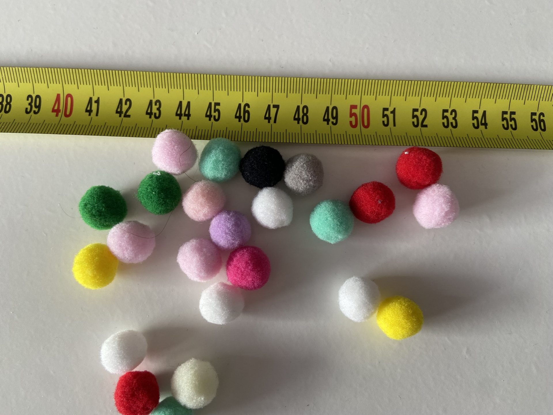 • Pompons coloridos de tecido e fita métrica amarela com números