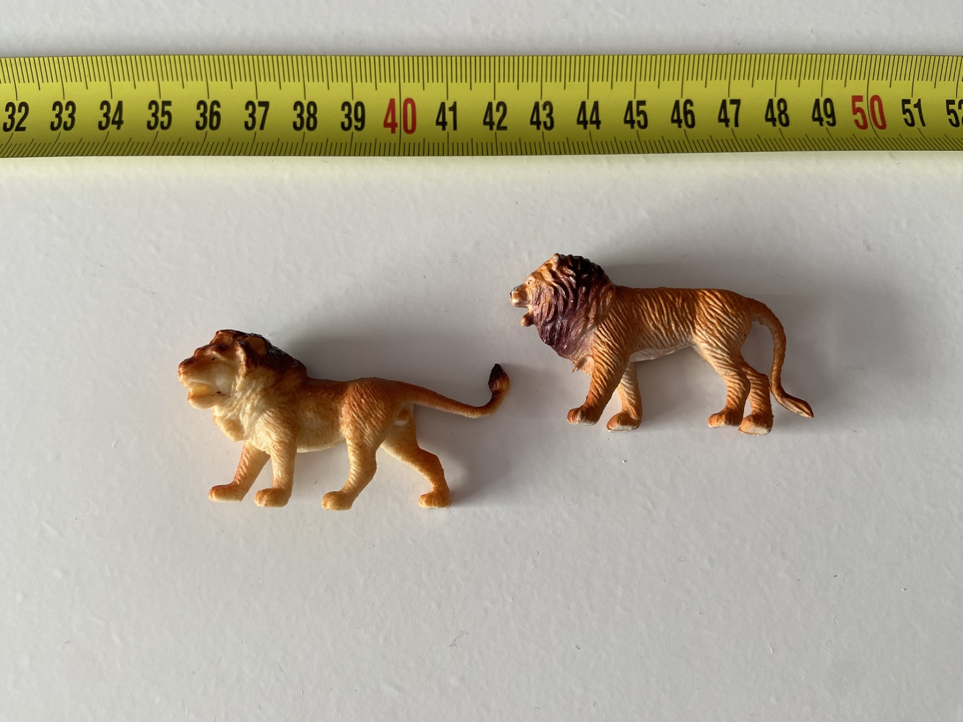• Duas miniaturas de leões em plástico em fundo branco, fita métrica amarela visível