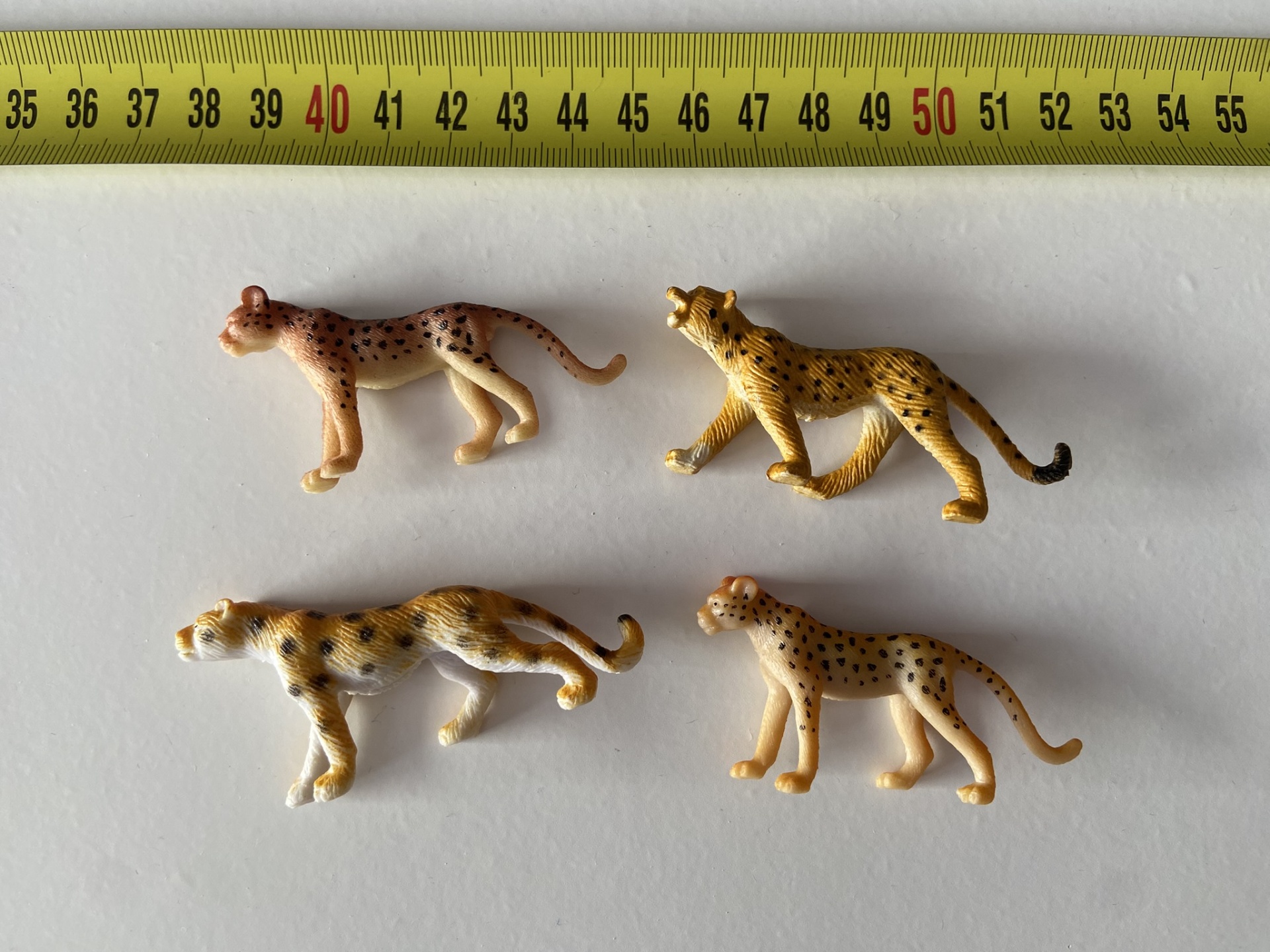 • Quatro miniaturas de leopardos com fita métrica amarela ao fundo