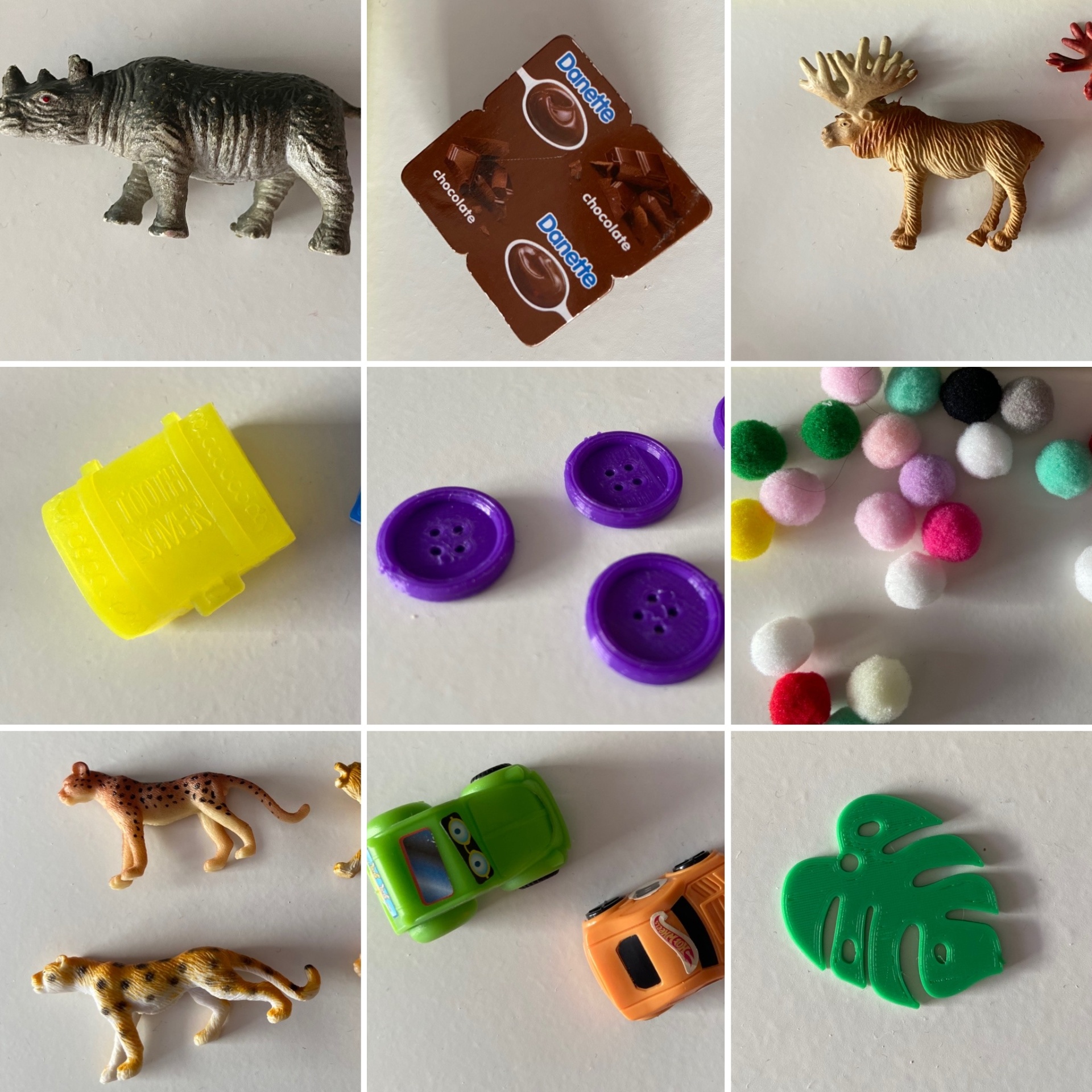 • Conjunto de vários objetos pequenos, incluindo brinquedos e materiais de artesanato.