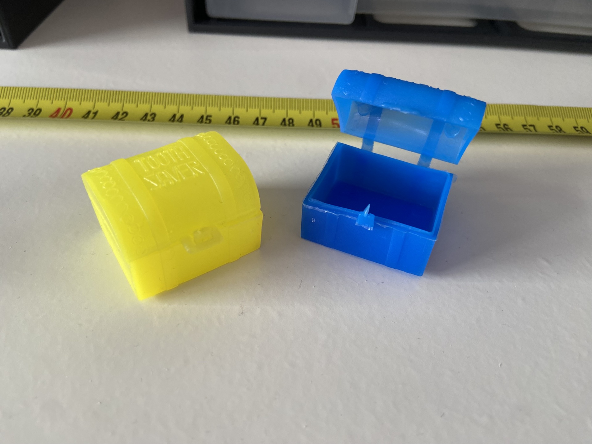 • Duas caixas plásticas em forma de baú, amarela e azul, com fita métrica ao fundo