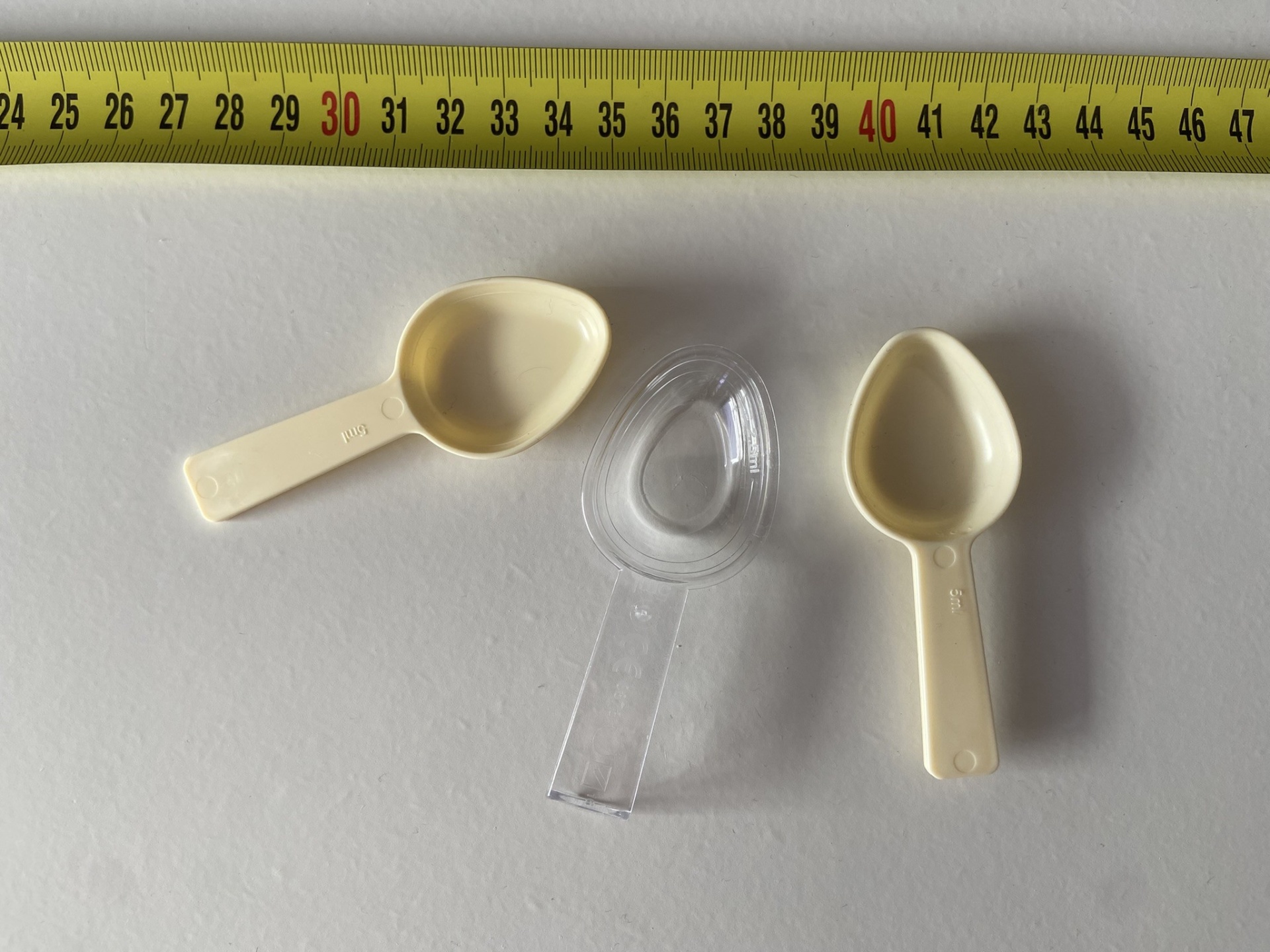 • Três colheres medidoras de plástico sobre fundo branco com régua amarela