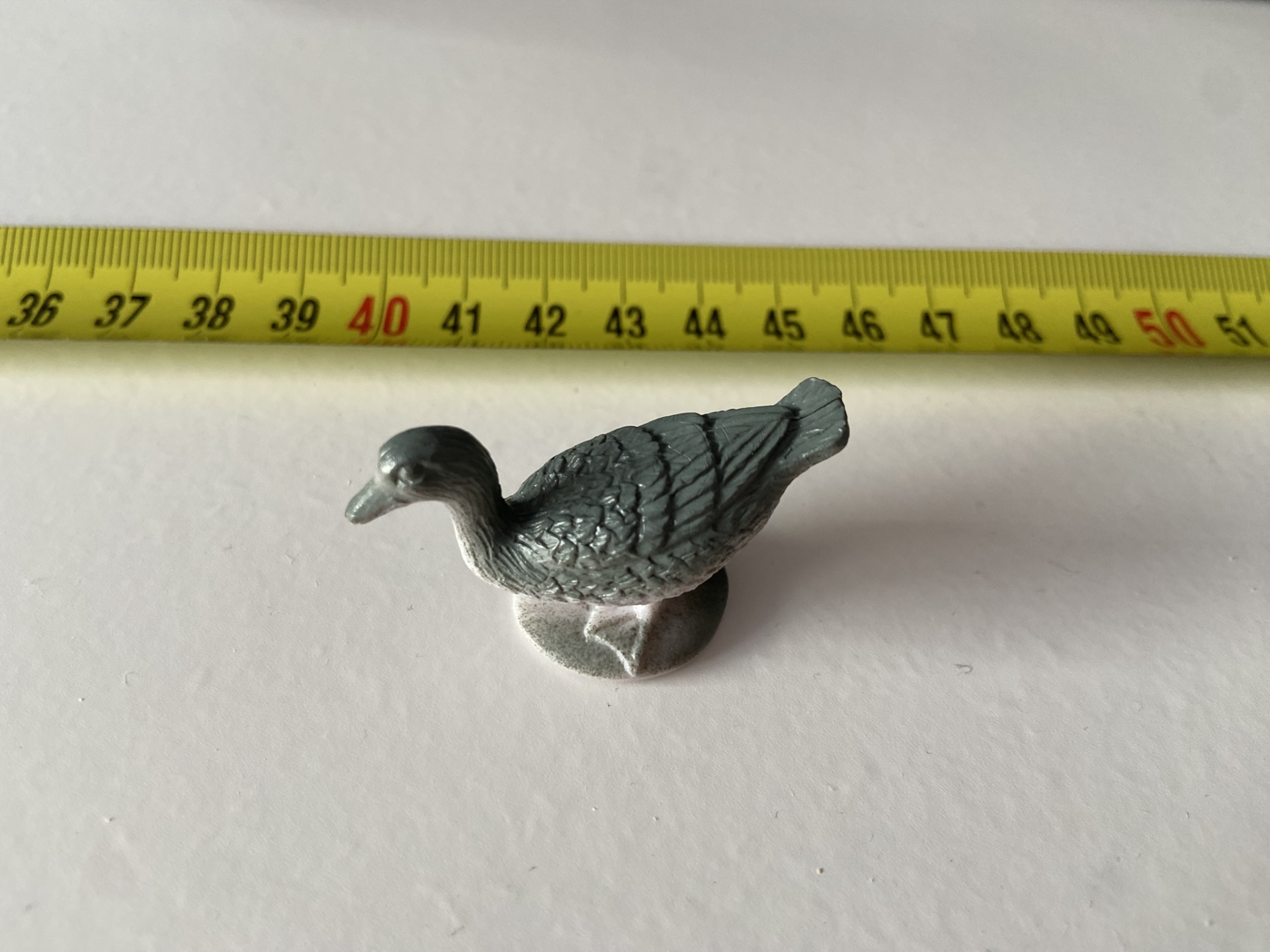 • Estatueta de pato cinzenta em relevo ao lado de fita métrica amarela