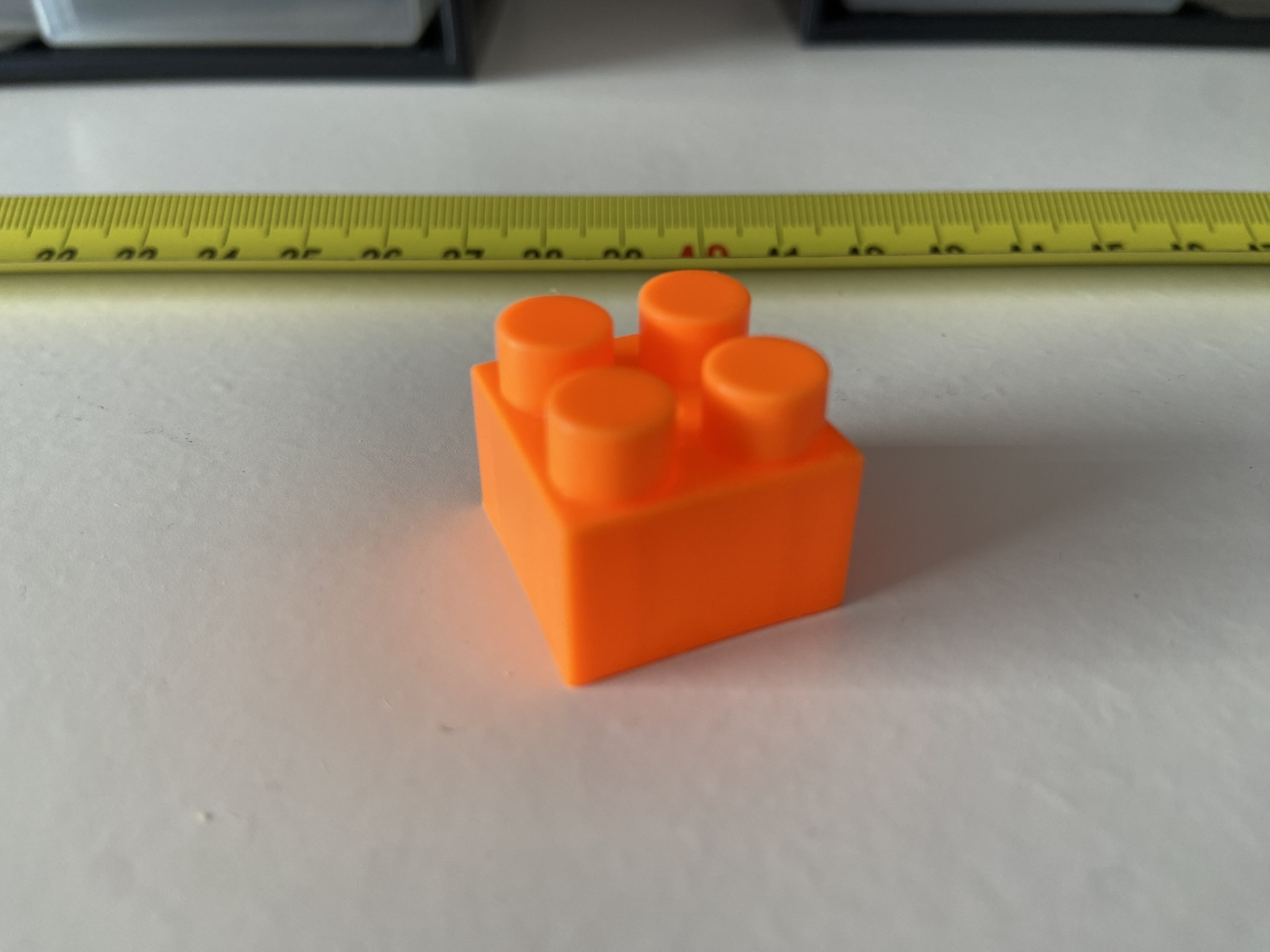 • Bloco de construção laranja com quatro pinos sobre superfície branca
