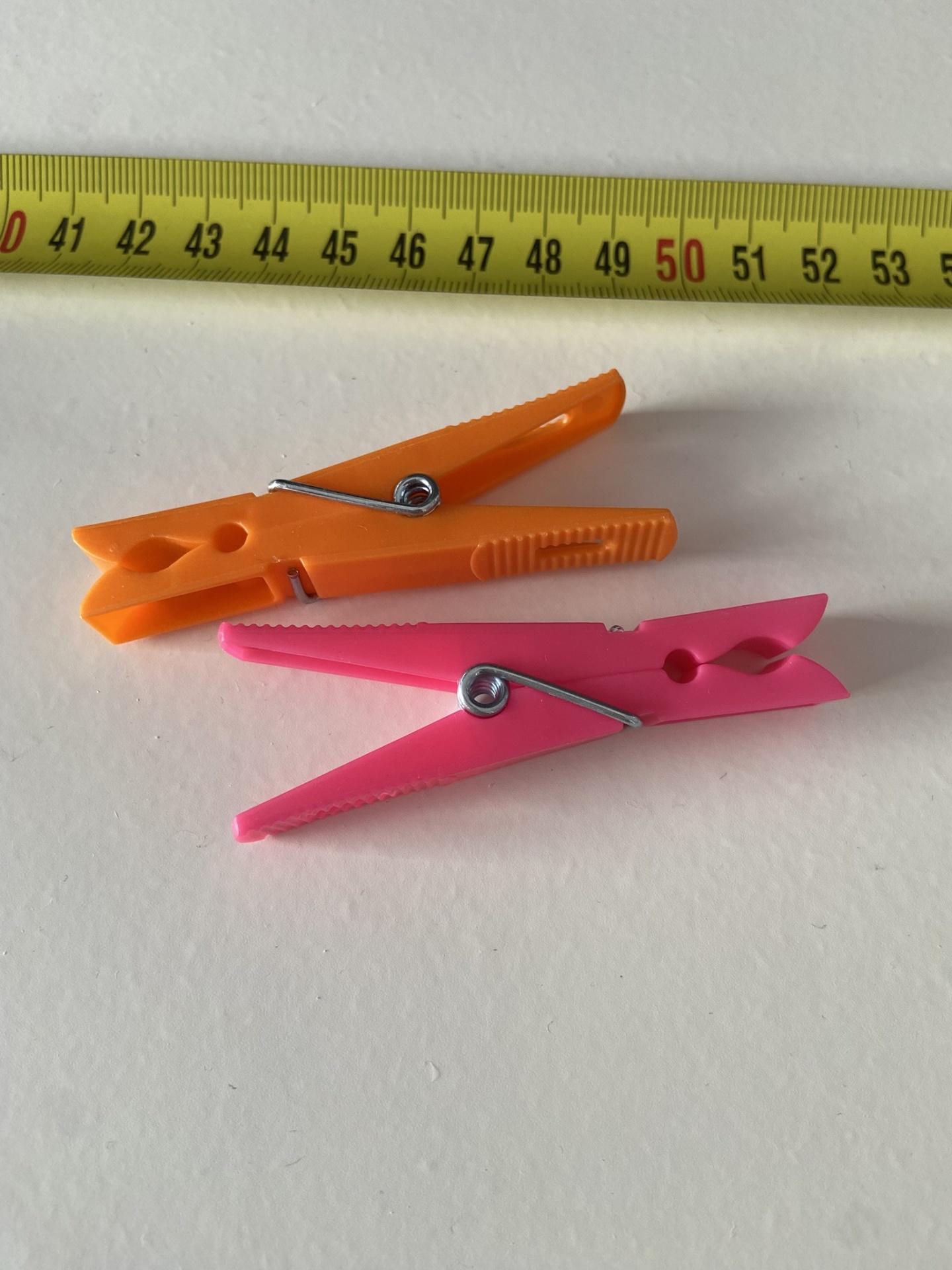 • Dois pregadores de roupa, um laranja e um rosa, sobre fundo branco, com fita métrica amarela acima.