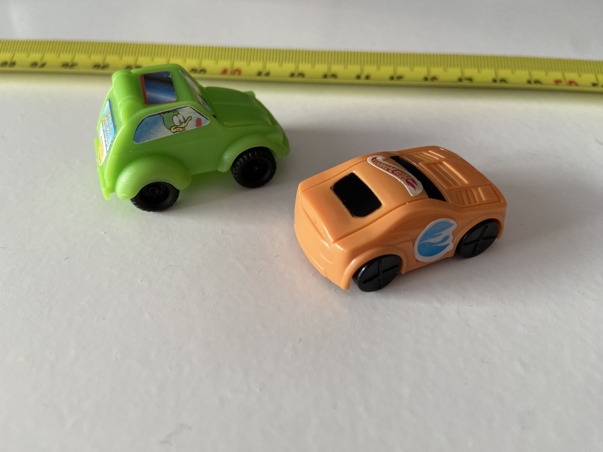 • Dois carros brinquedo verde e laranja com adesivos sobre superfície branca e fita métrica ao fundo