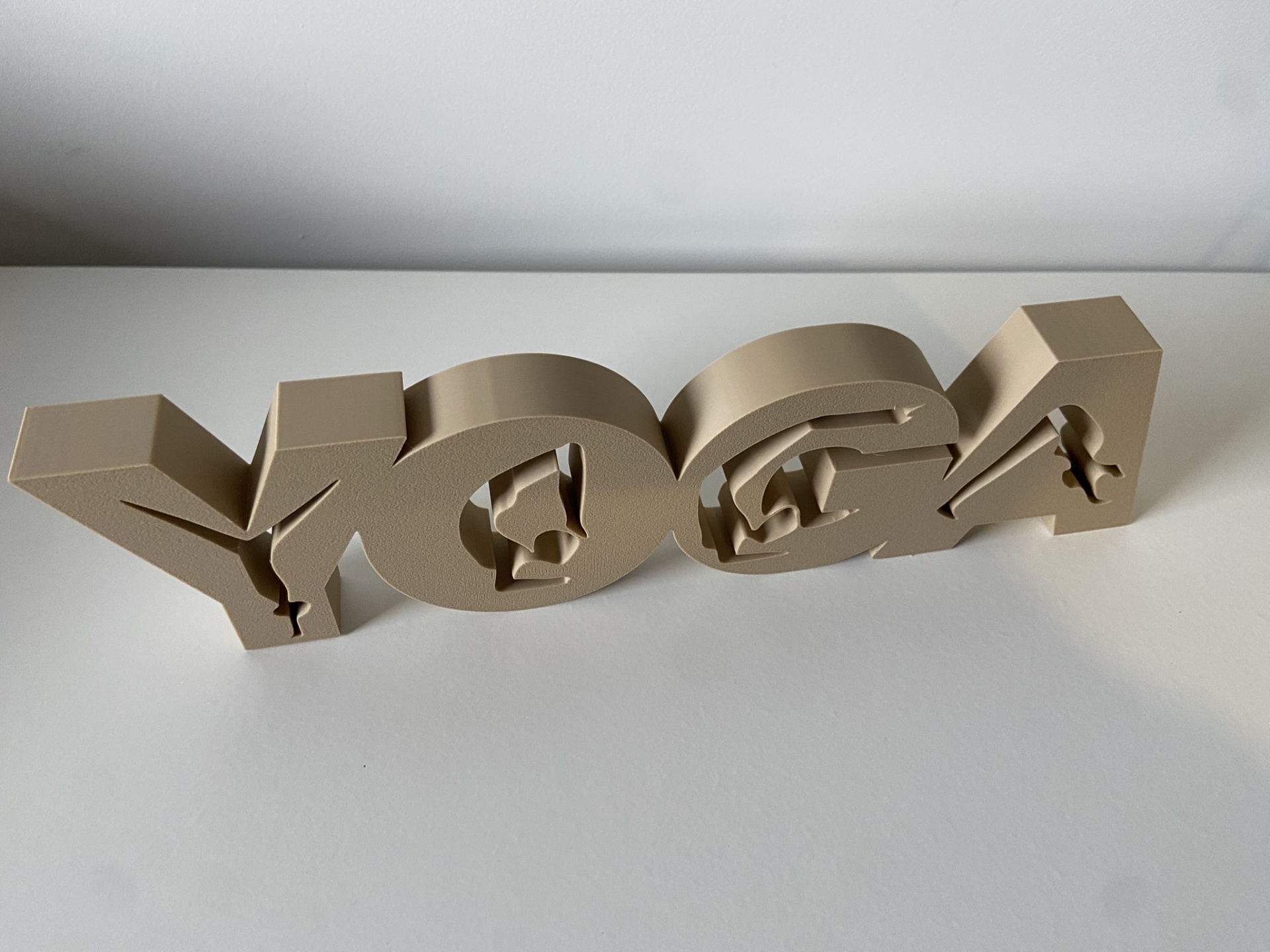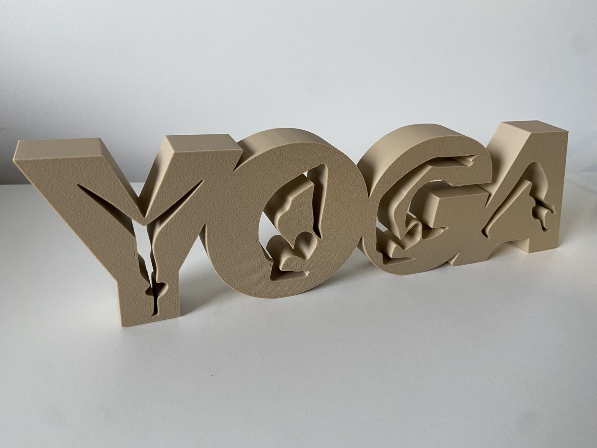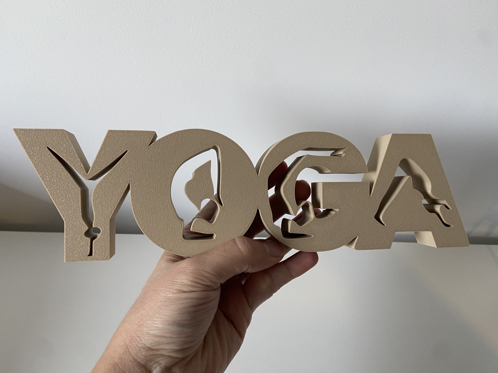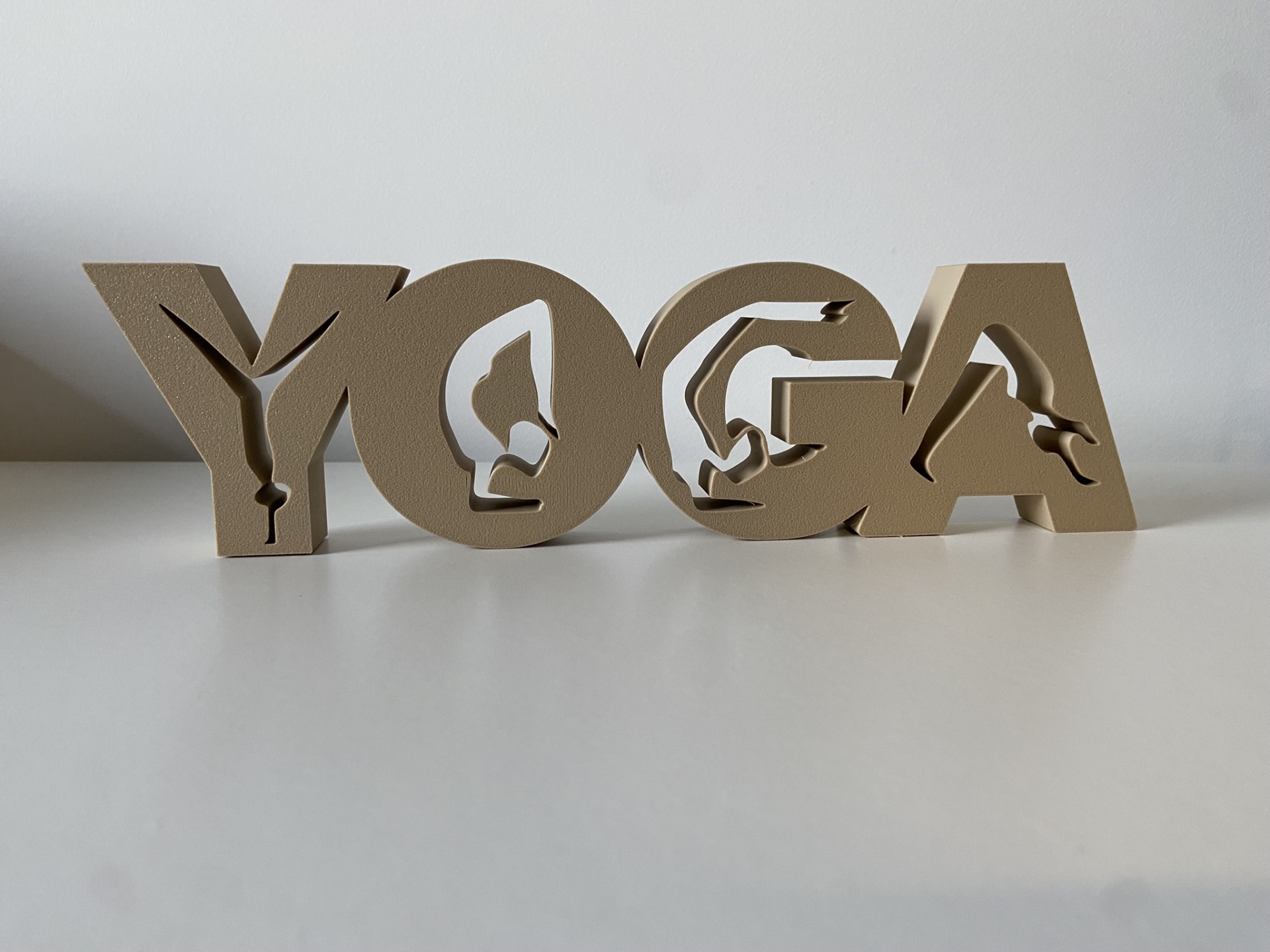 Peça decorativa com a palavra Yoga, pensada para pousar em prateleiras, mesas, aparadores ou no seu cantinho dedicado à prática de yoga.