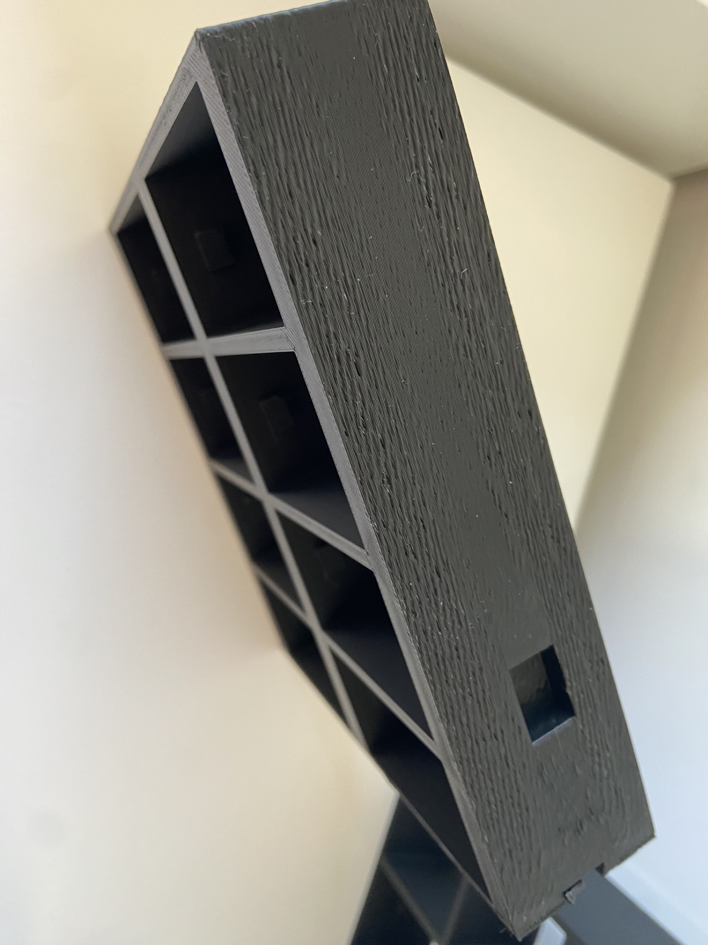 • Estante modular preta de plástico com nove compartimentos quadrados e texturizada.