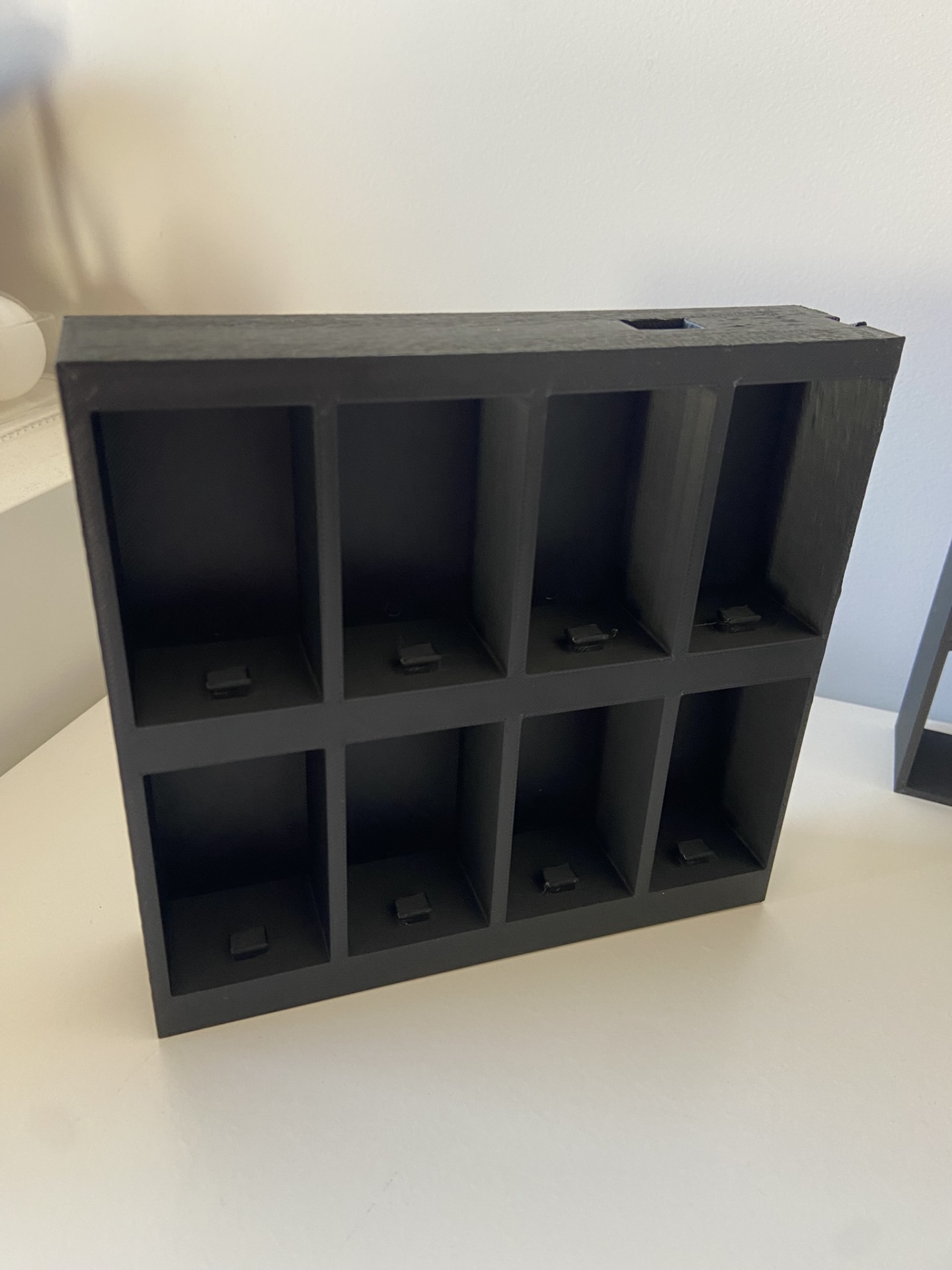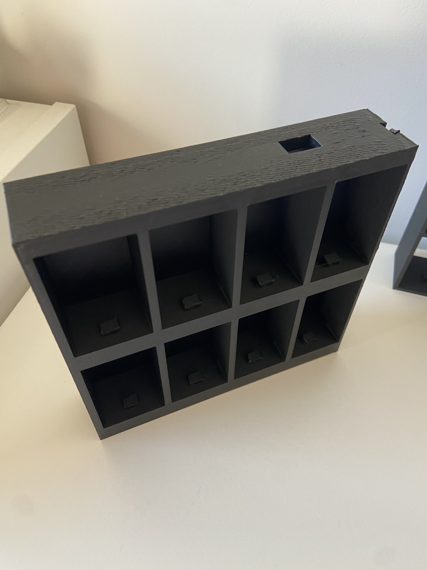 • Estrutura organizadora preta com oito compartimentos sobre superfície branca