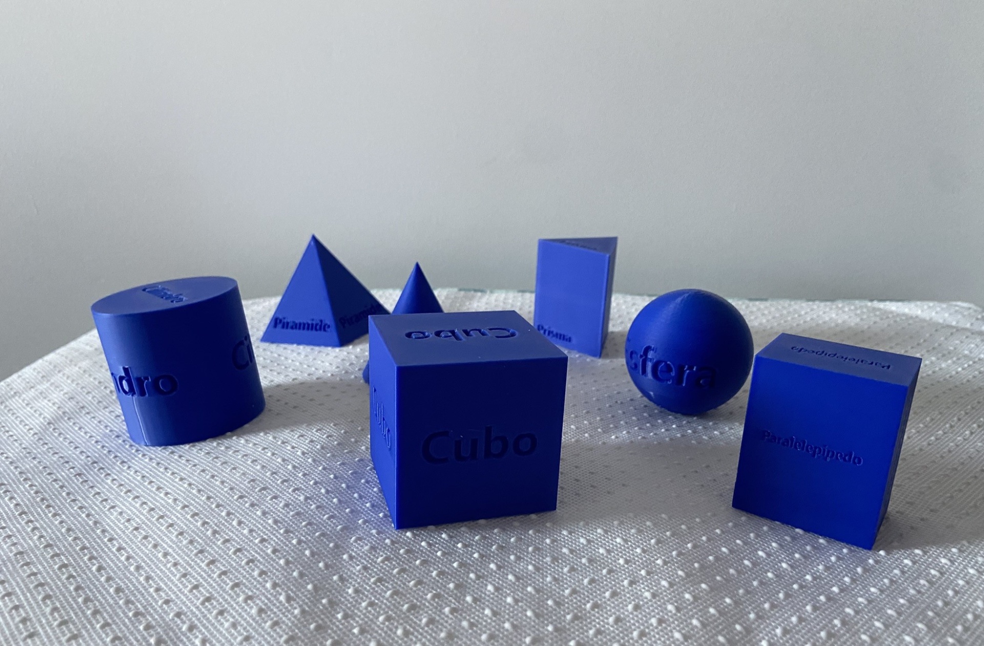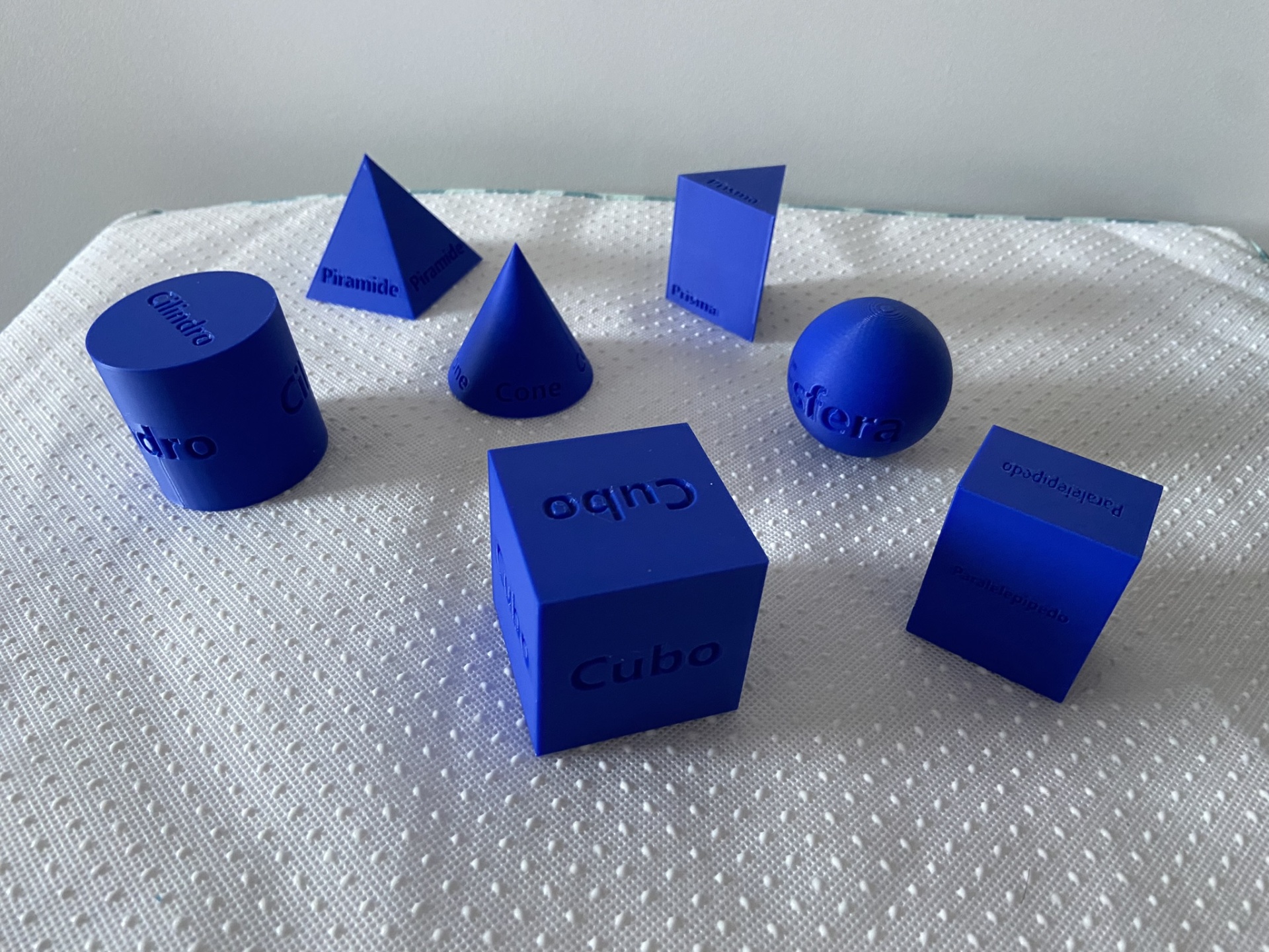 Cada sólido geométrico tem o nome inscrito em relevo, em todas as faces.