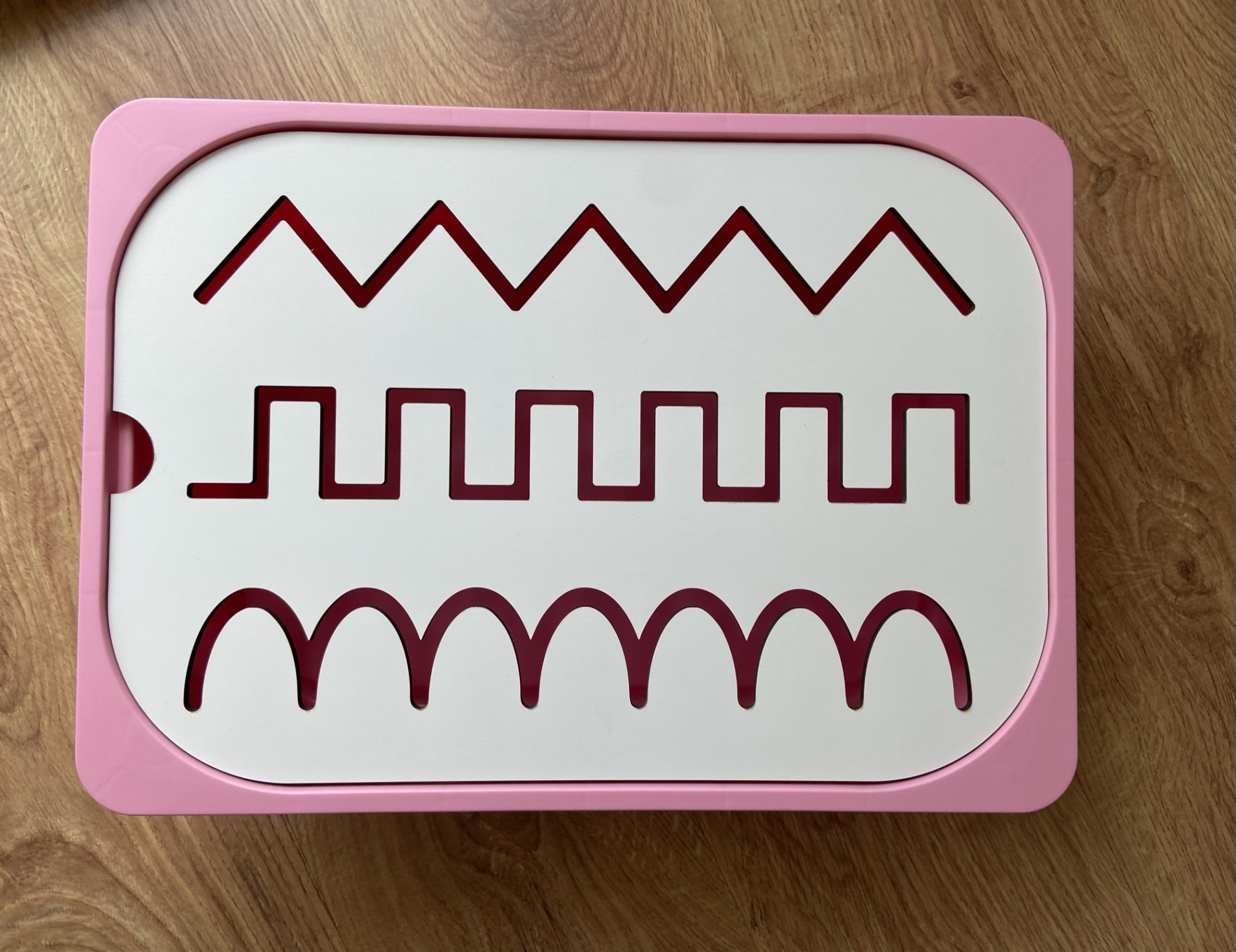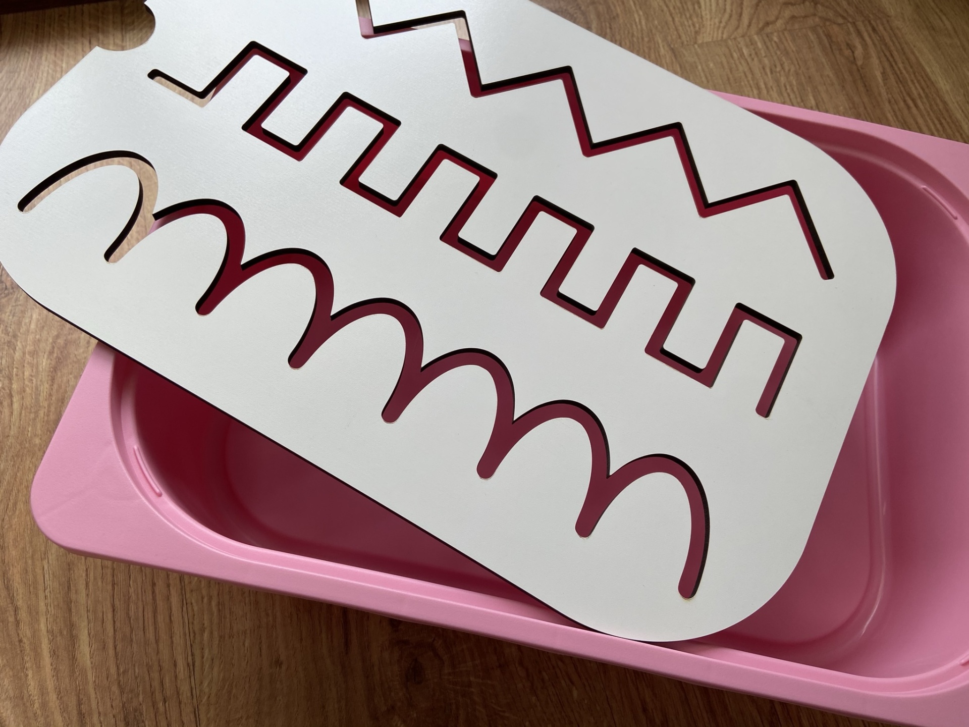 • Tabuleiro de corte rosa e branco com moldes recortados em vermelho sobre mesa de madeira clara.