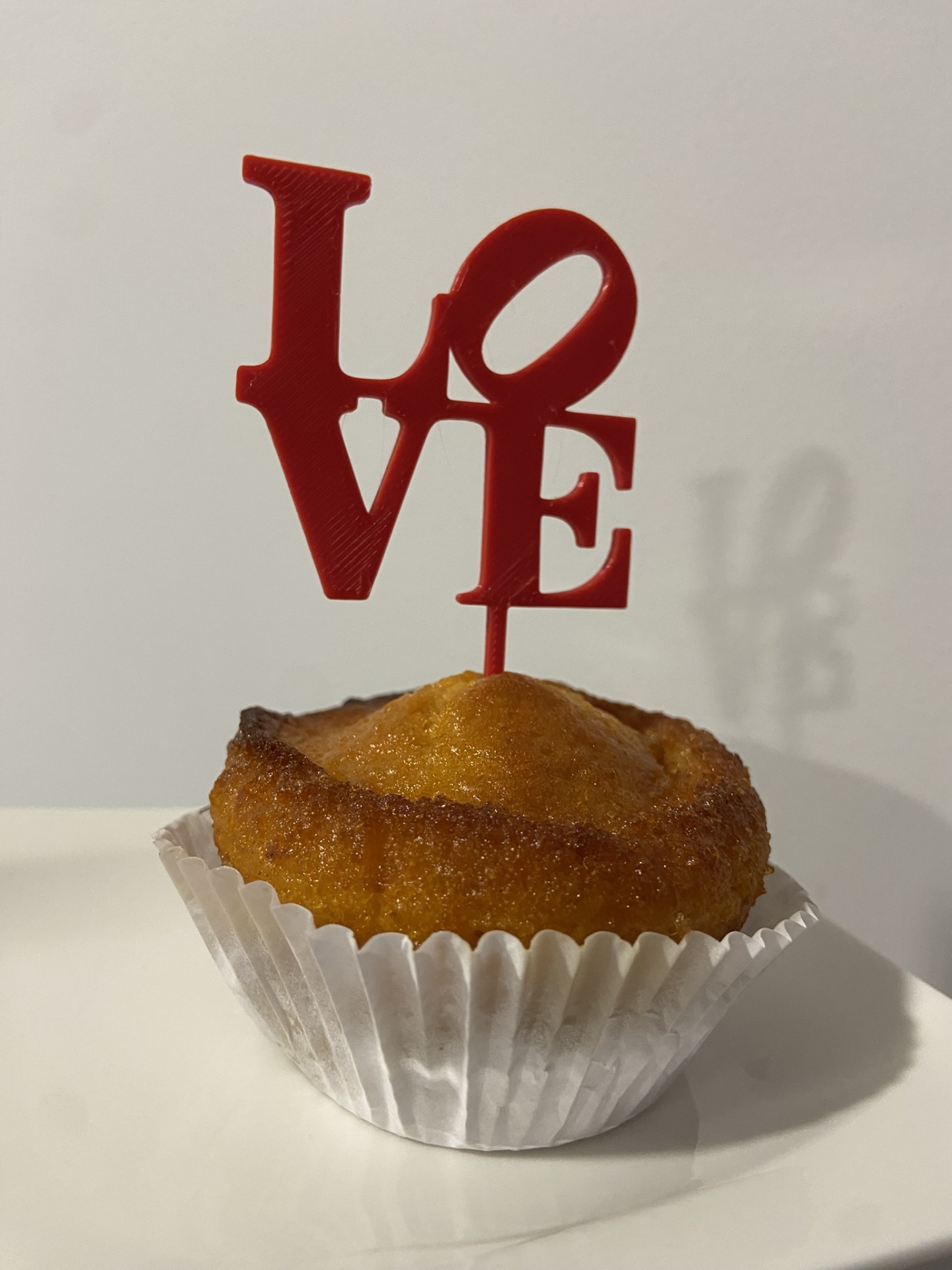 • Cupcake amarelo num papel branco com topo decorativo vermelho a dizer LOVE