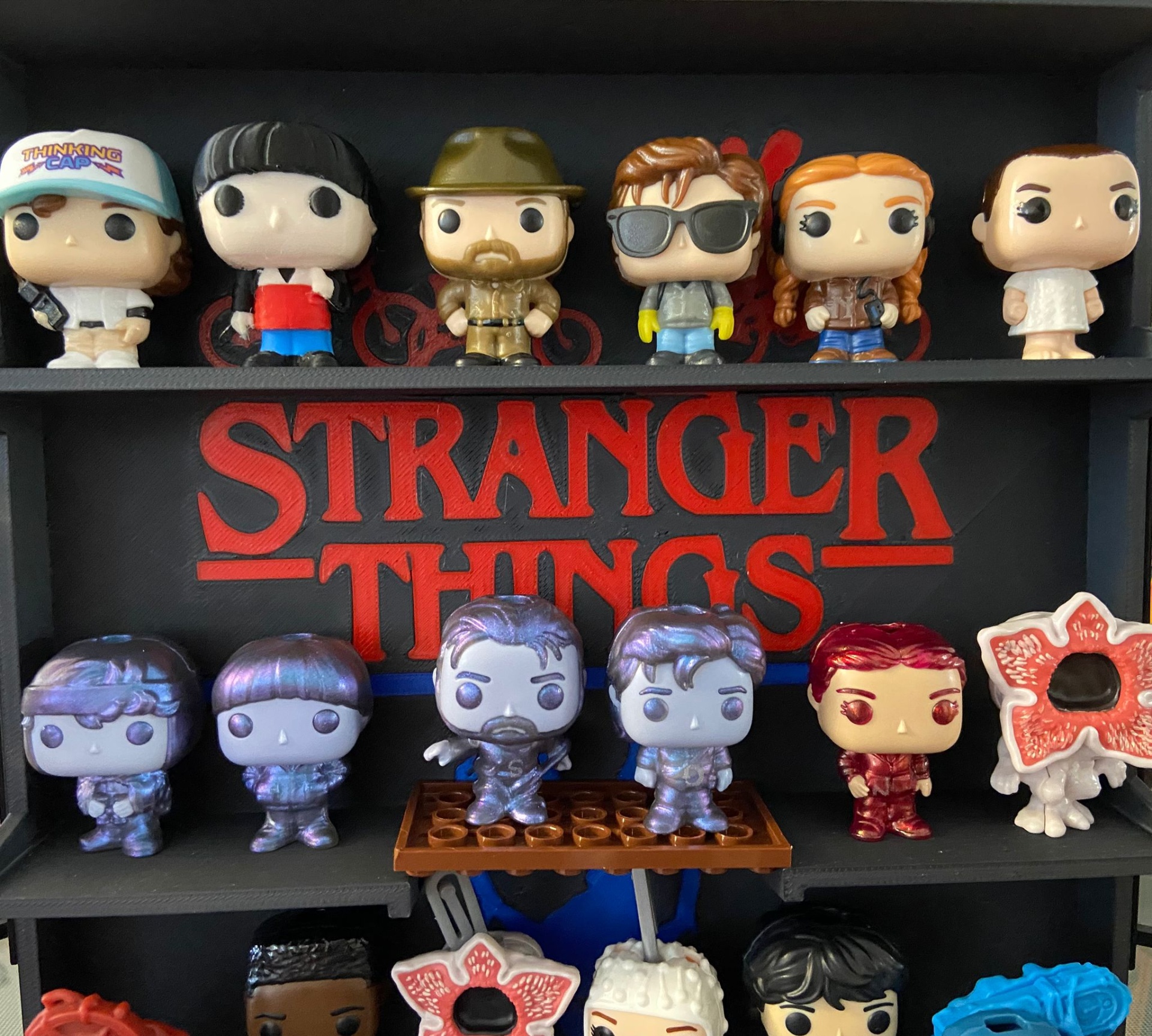 • Figuras Funko Pop de Stranger Things em prateleira negra com texto vermelho ao fundo